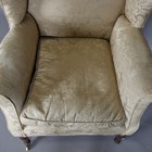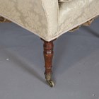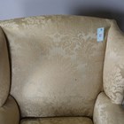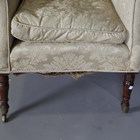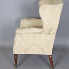 A late George III mahogany wing back armchair, upholstered in yellow damask and raised on turned mahogany legs, height 109cm, width 67cm, depth 69cm.