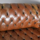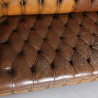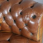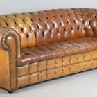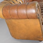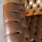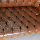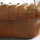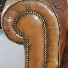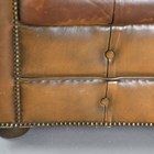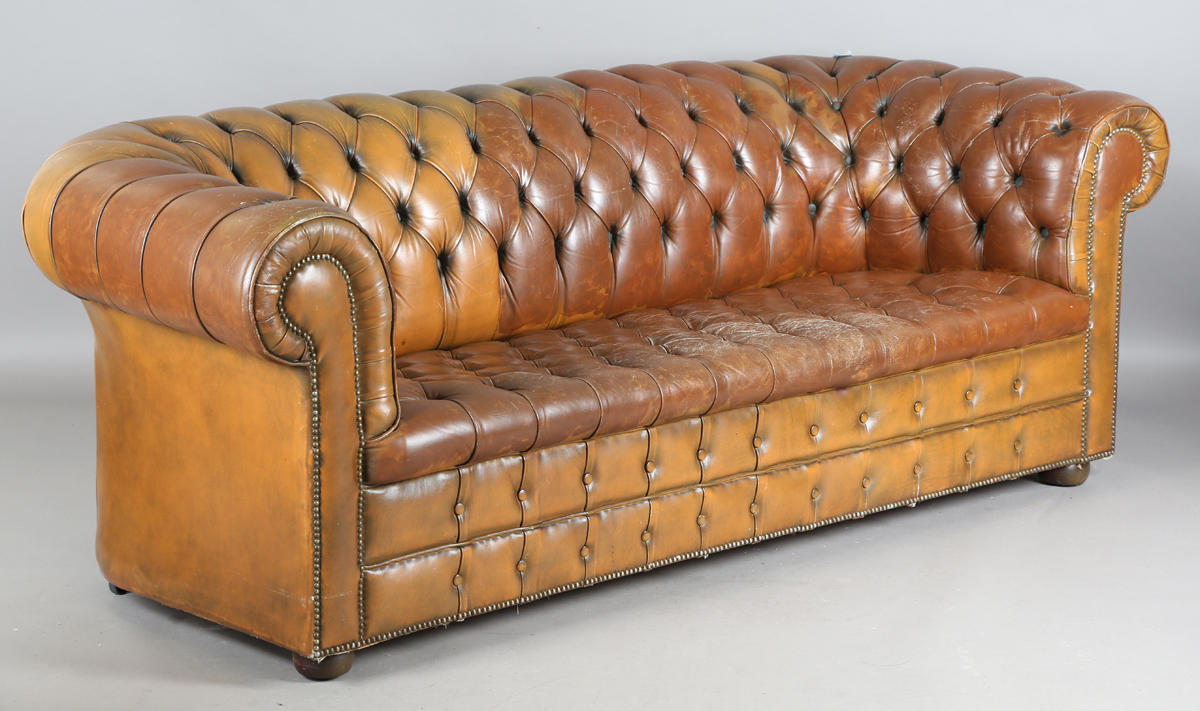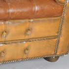 A 20th century buttoned brown leather Chesterfield settee with brass studded borders, height 74cm, width 216cm, depth 90cm.