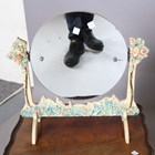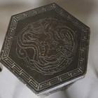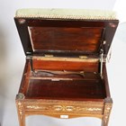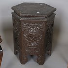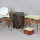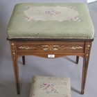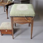 An Edwardian mahogany and foliate inlaid box seat piano stool, width 48cm, together with a chinoiserie carved hexagonal occasional table, width 38cm, a 20th century mahogany occasional table, a Barbola style dressing table mirror and a box seat stool.