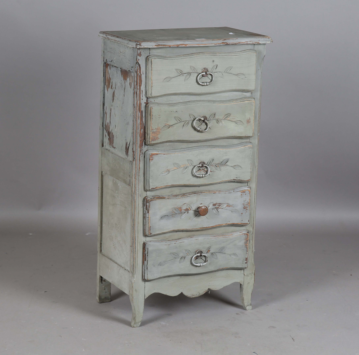 An early 20th century French grey painted chest of five drawers, height 106cm, width 56cm, depth 36cm.