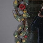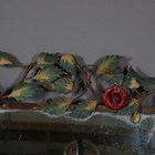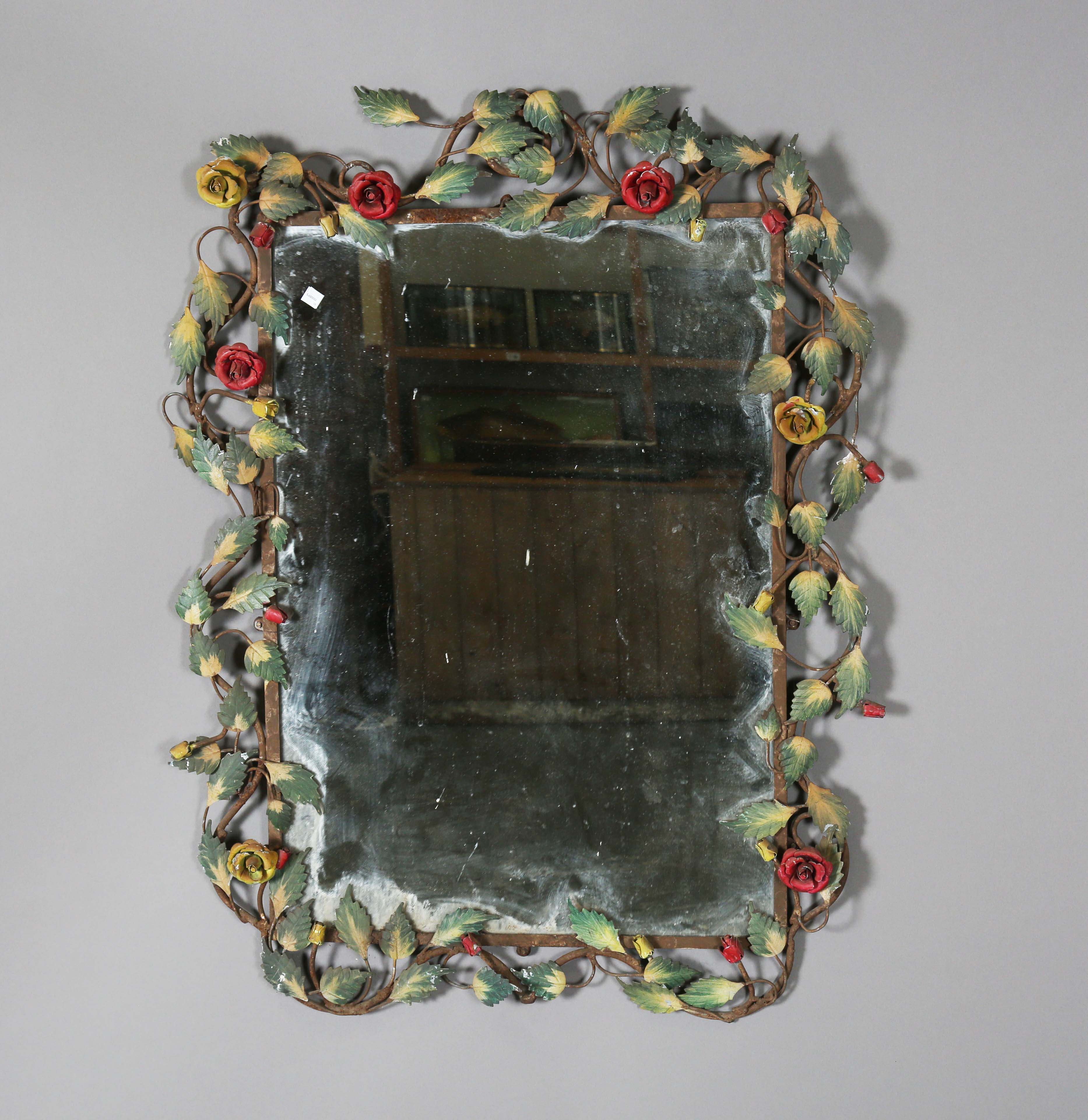 A 20th century tole painted wall mirror, the frame modelled with wrought metal roses and leaves, height 98cm, width 75cm.