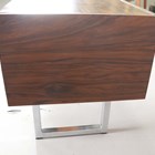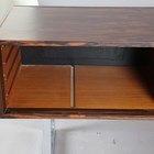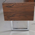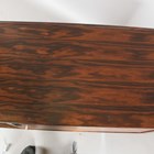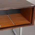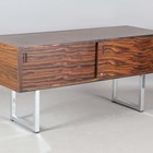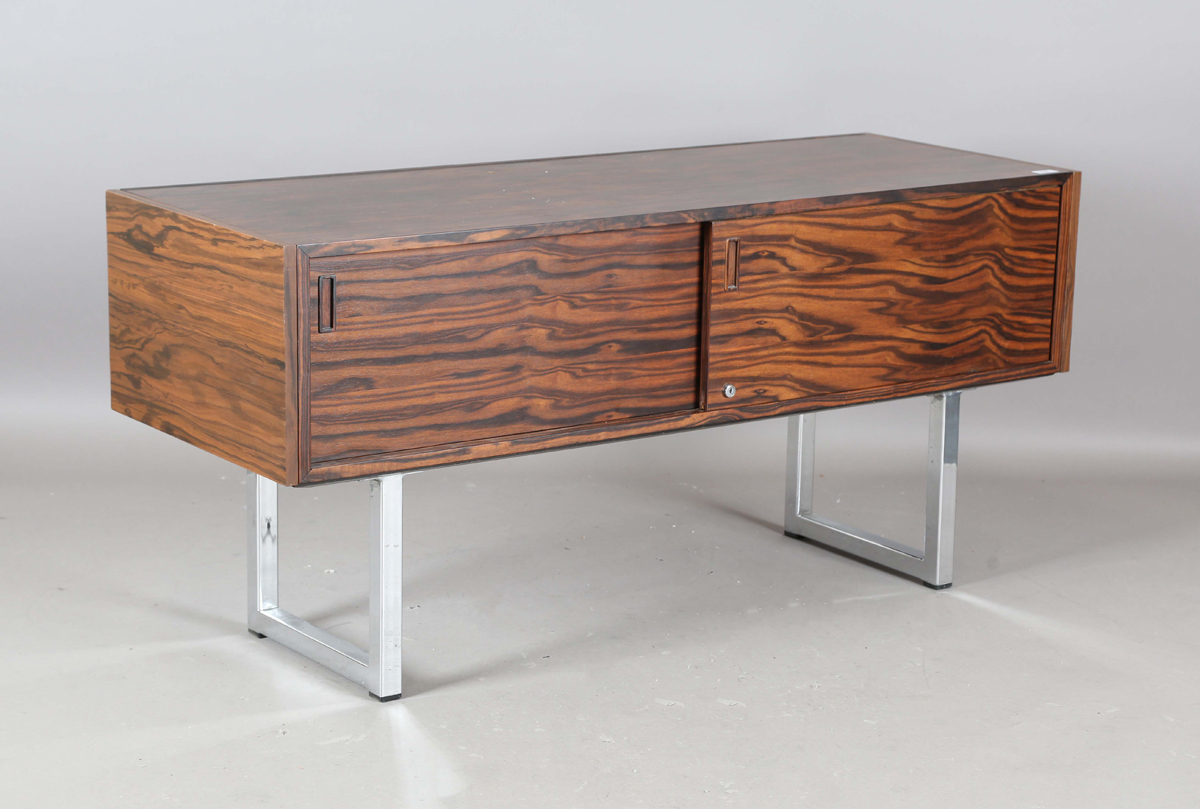 A mid/late 20th century rosewood sideboard, possibly designed by Gordon Russell, the two sliding doors above chromium plated sledge style supports, height 65.5cm, width 140cm, depth 51cm. Note: a Cites Article 10 Certificate has been granted to sell this lot.