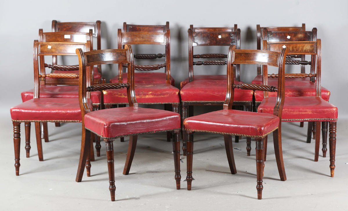 A harlequin set of twelve Regency mahogany bar back dining chairs, all with spiral reeded centre rails, height 84cm, width 52cm, depth 59cm (some faults).