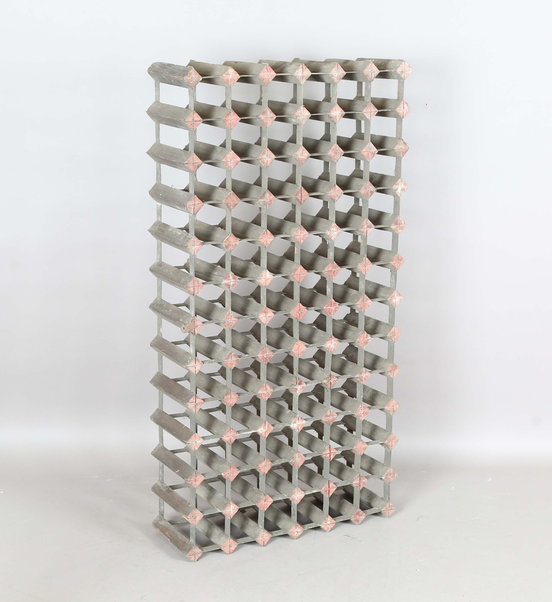 An early 20th century zinc and pine 72 bottle wine rack, height 130cm, width 68cm.