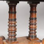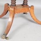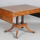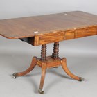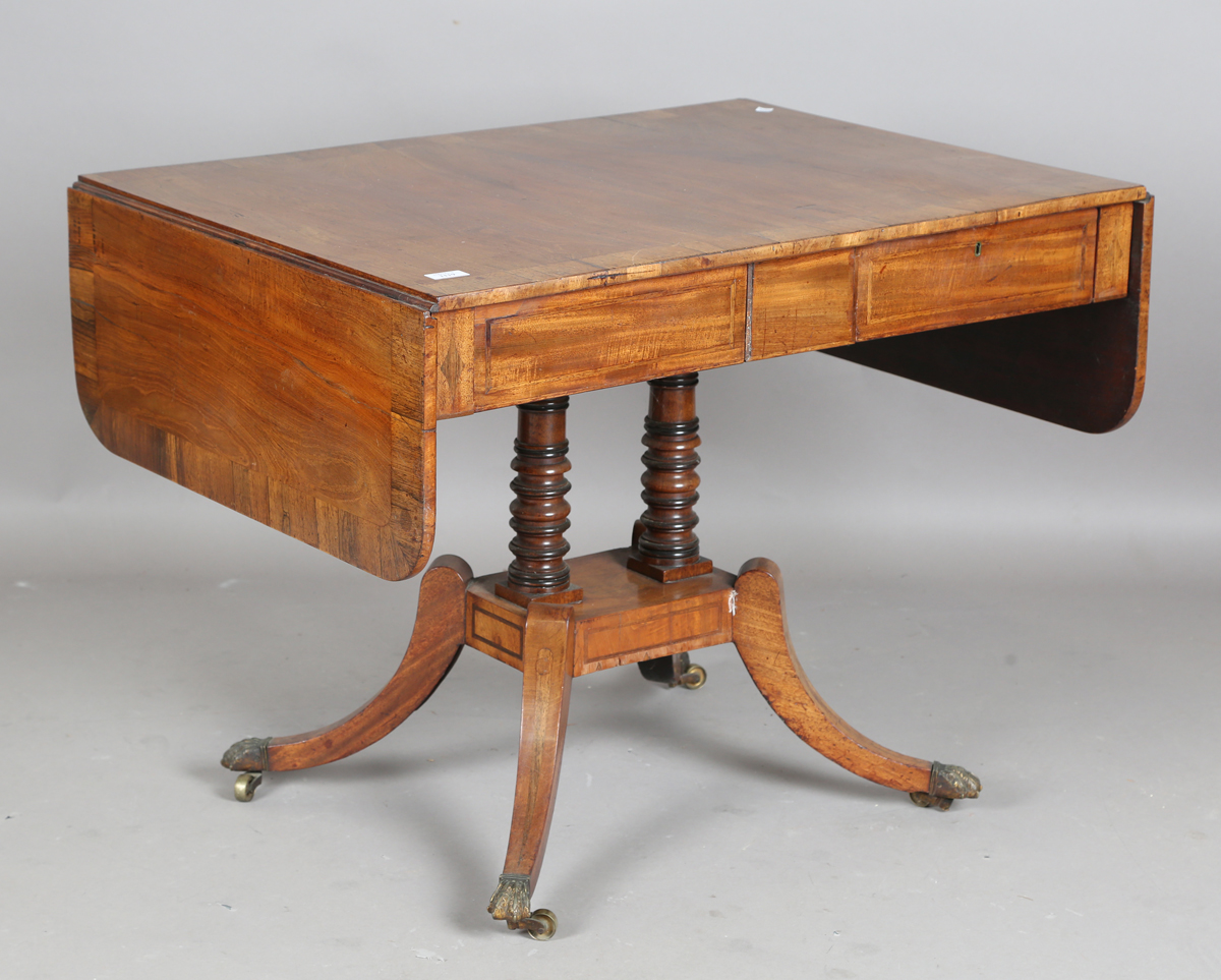 A Regency mahogany sofa table with crossbanded borders and inlaid decoration, height 69cm, extended width 126cm, depth 66cm.