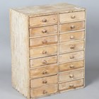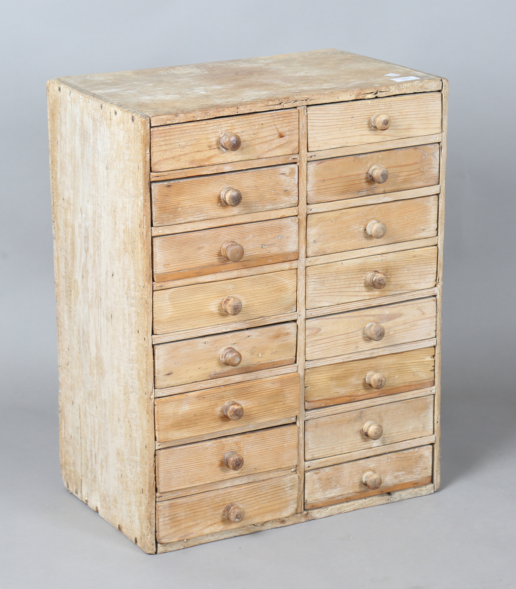 A 19th century pine bank of sixteen drawers, height 62cm, width 48cm, depth 30cm. Provenance: previously from the estate of the Late Raymond Briggs, the author of The Snowman. Toovey's 18th April 2024, Lot 2096.