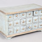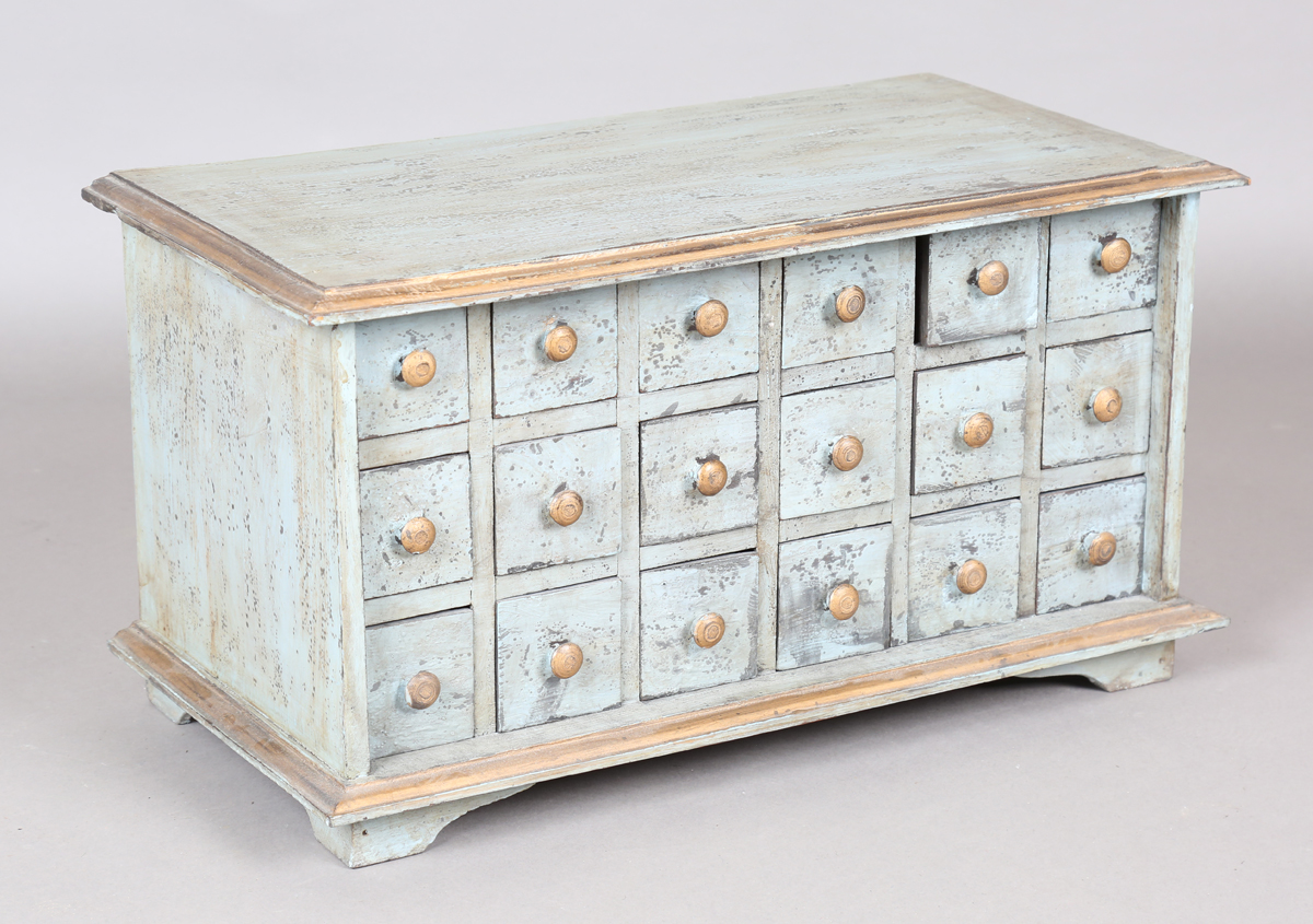 A 20th century Indian painted hardwood spice chest of eighteen drawers, height 33cm, width 63cm, depth 32cm.