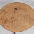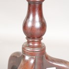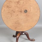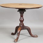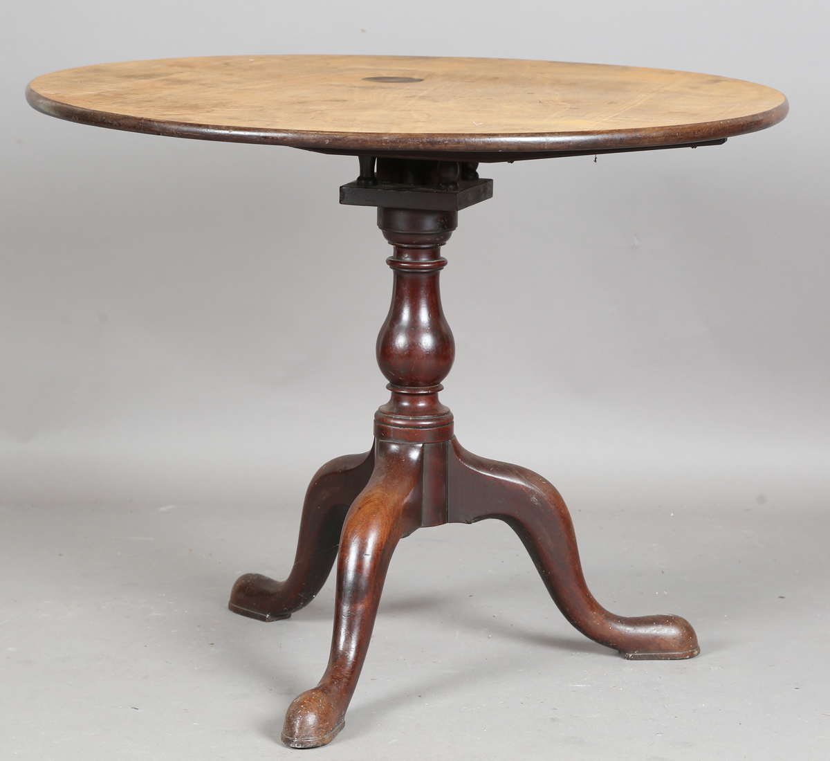 A George III mahogany circular tip-top supper table, fitted with a birdcage mount above a turned baluster stem and tripod legs, height 72cm, diameter 91cm (stripped top).
