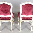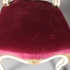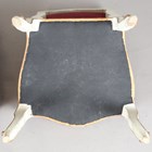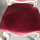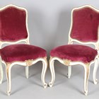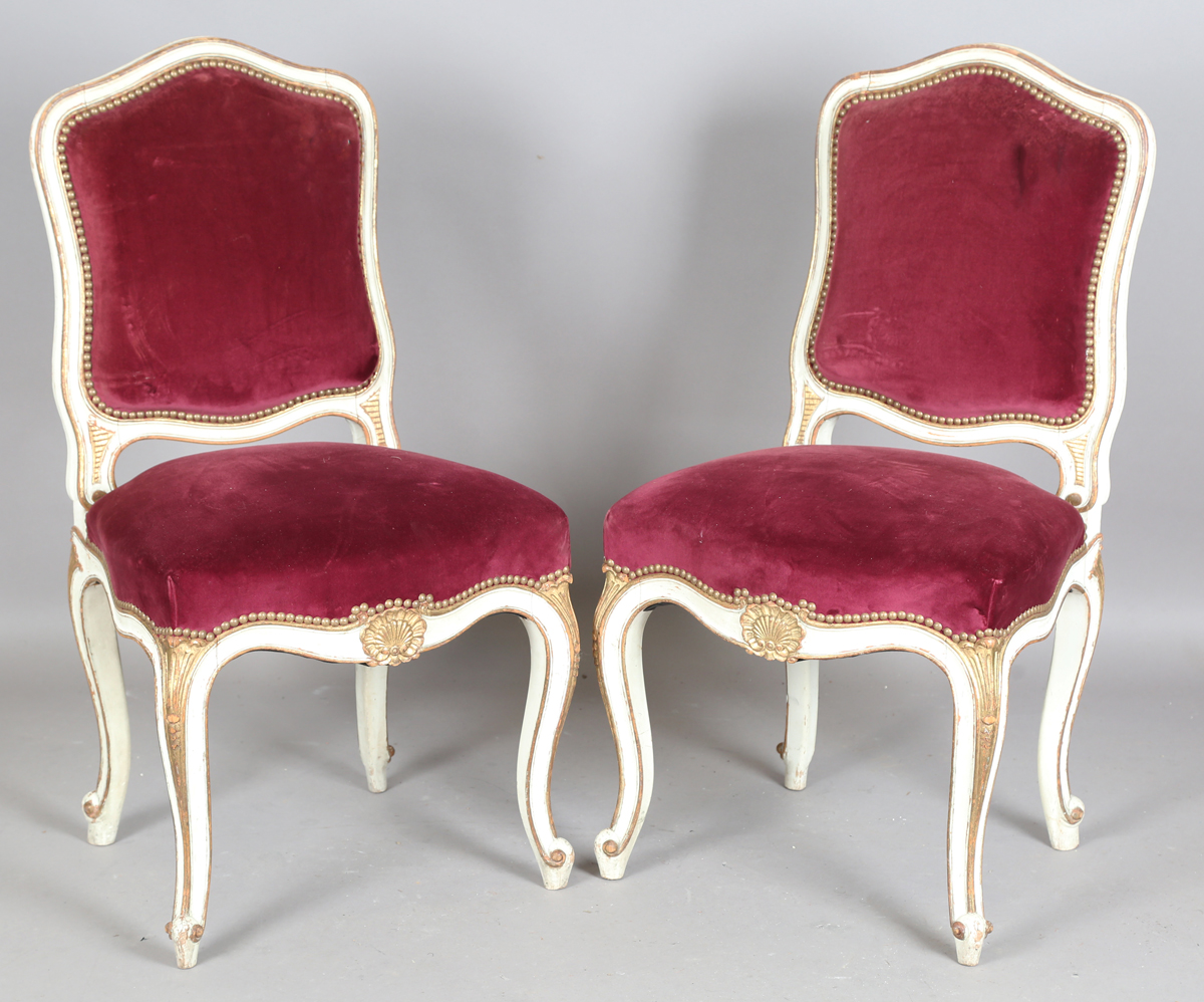 A pair of 20th century French white painted and parcel gilt side chairs, upholstered in claret velour, on cabriole legs, height 96cm, width 51cm, depth 54cm.