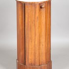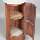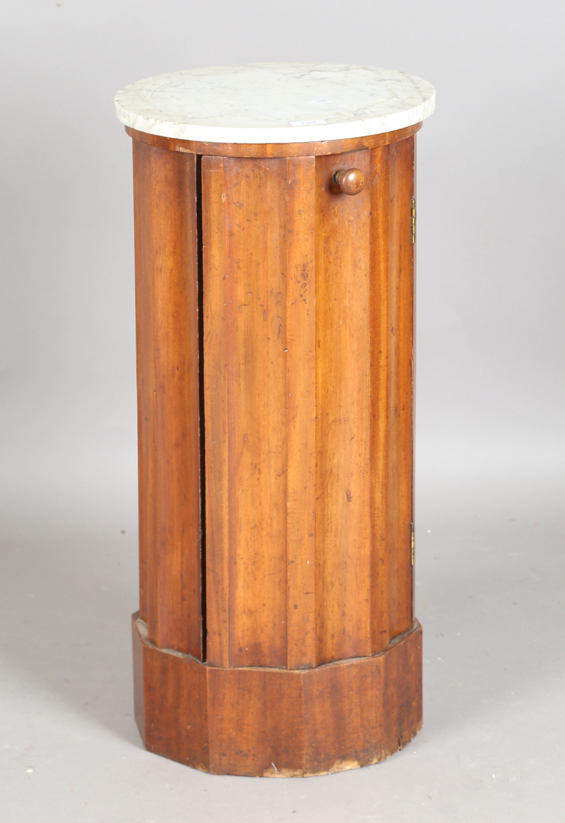 A Victorian mahogany 'pillar box' bedside cupboard with white marble top, height 76cm, diameter 37cm.