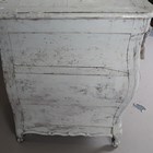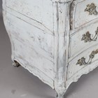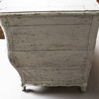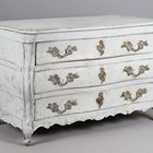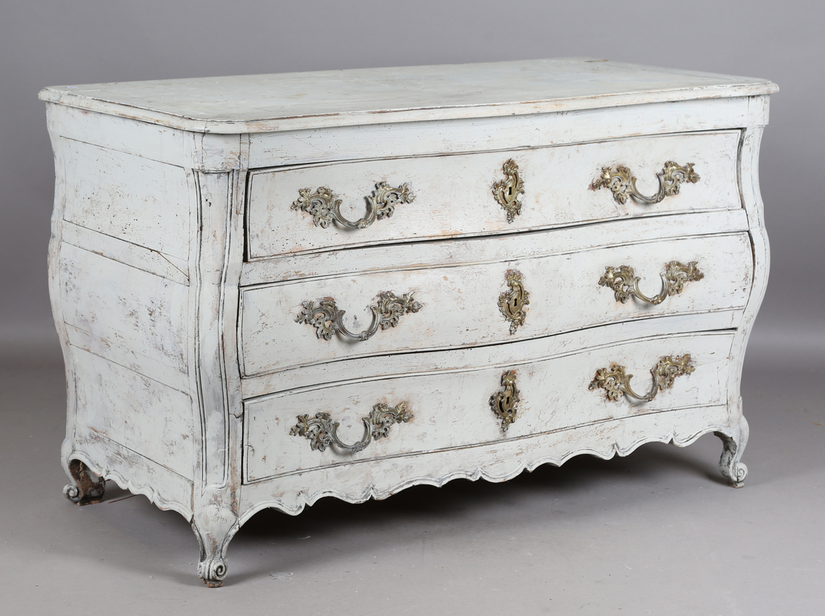 An 18th century French Rococo grey painted commode, fitted with three long drawers and brass handles, of bombé form, height 84cm, width 134cm, depth 69cm.