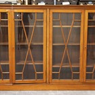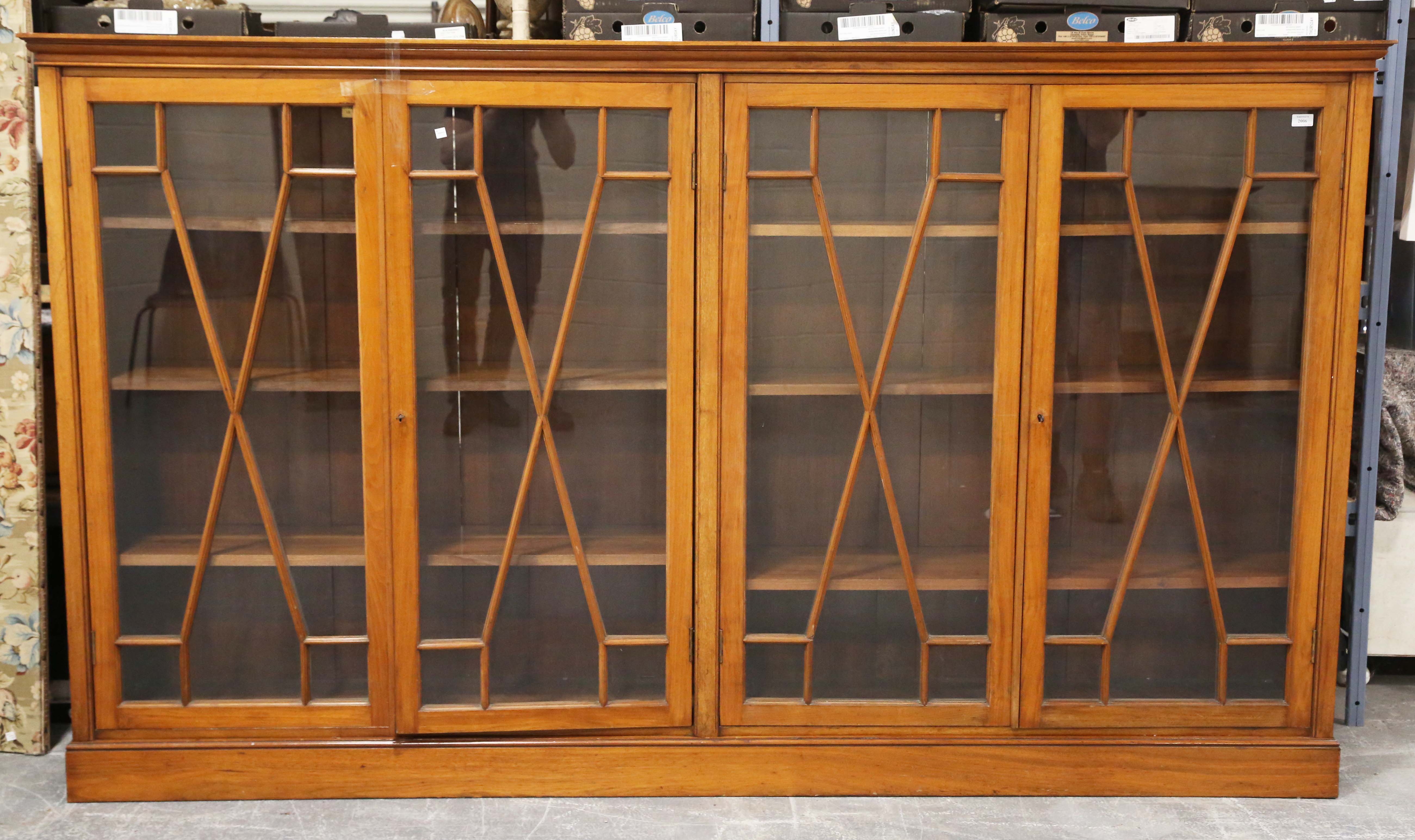 An Edwardian walnut two-section bookcase cabinet, fitted with four astragal glazed doors, on a plinth base, height 142cm, width 243cm, depth 37cm.