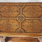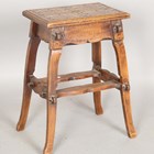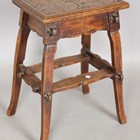 An early 20th century Arts and Crafts oak joint stool, the relief carved seat above peg jointed legs, bearing label to underside inscribed '... made by Ernest Henry White... circa 1915', height 55cm, width 44cm, depth 31cm.