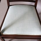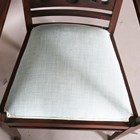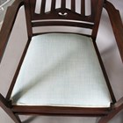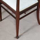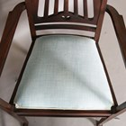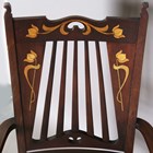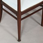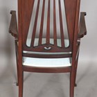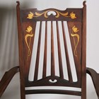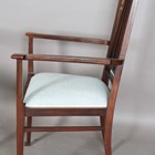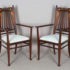 A pair of Edwardian Arts and Crafts mahogany elbow chairs with foliate inlaid backs and blue fabric overstuffed seats, height 106cm, width 61cm.