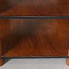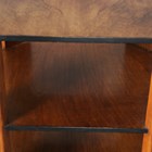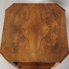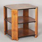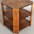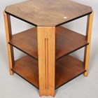 An Art Deco walnut three-tier book table with canted corners, height 49cm, width 47cm.