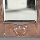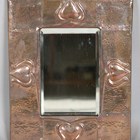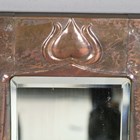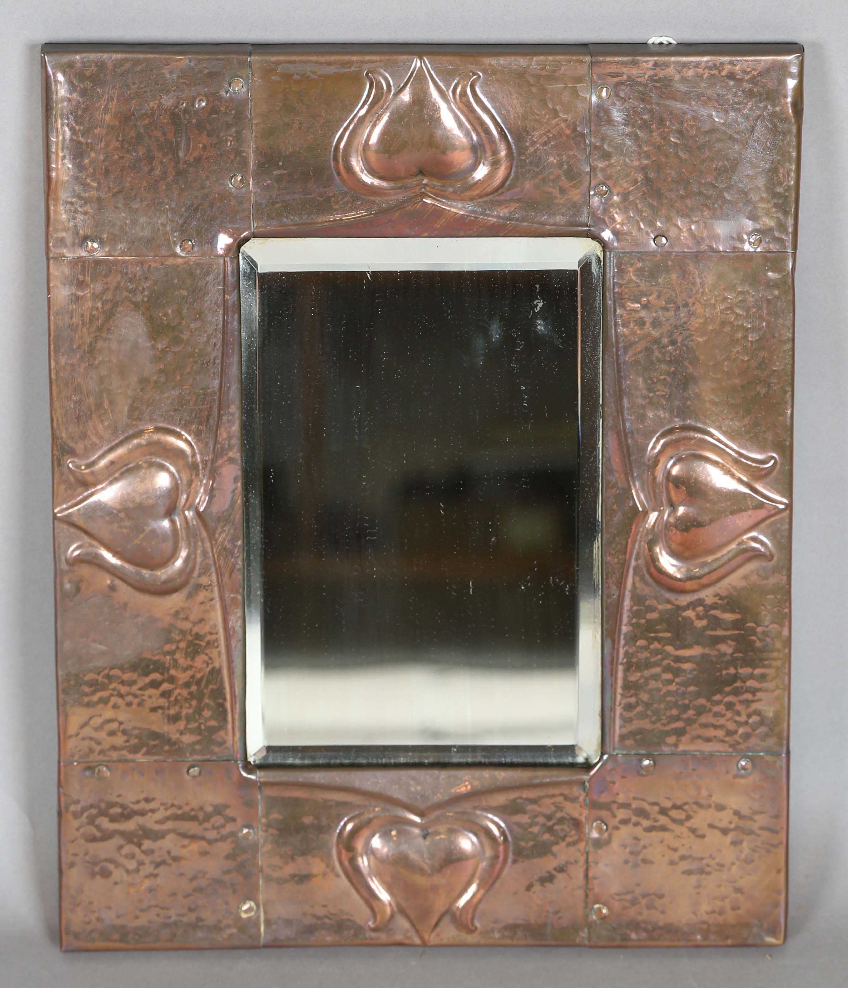 An early 20th century Arts and Crafts copper framed wall mirror, possibly retailed by Liberty & Co, the sectional frame with rivet joints and decorated with stylized tulip heads, 37.5cm x 29.5cm.