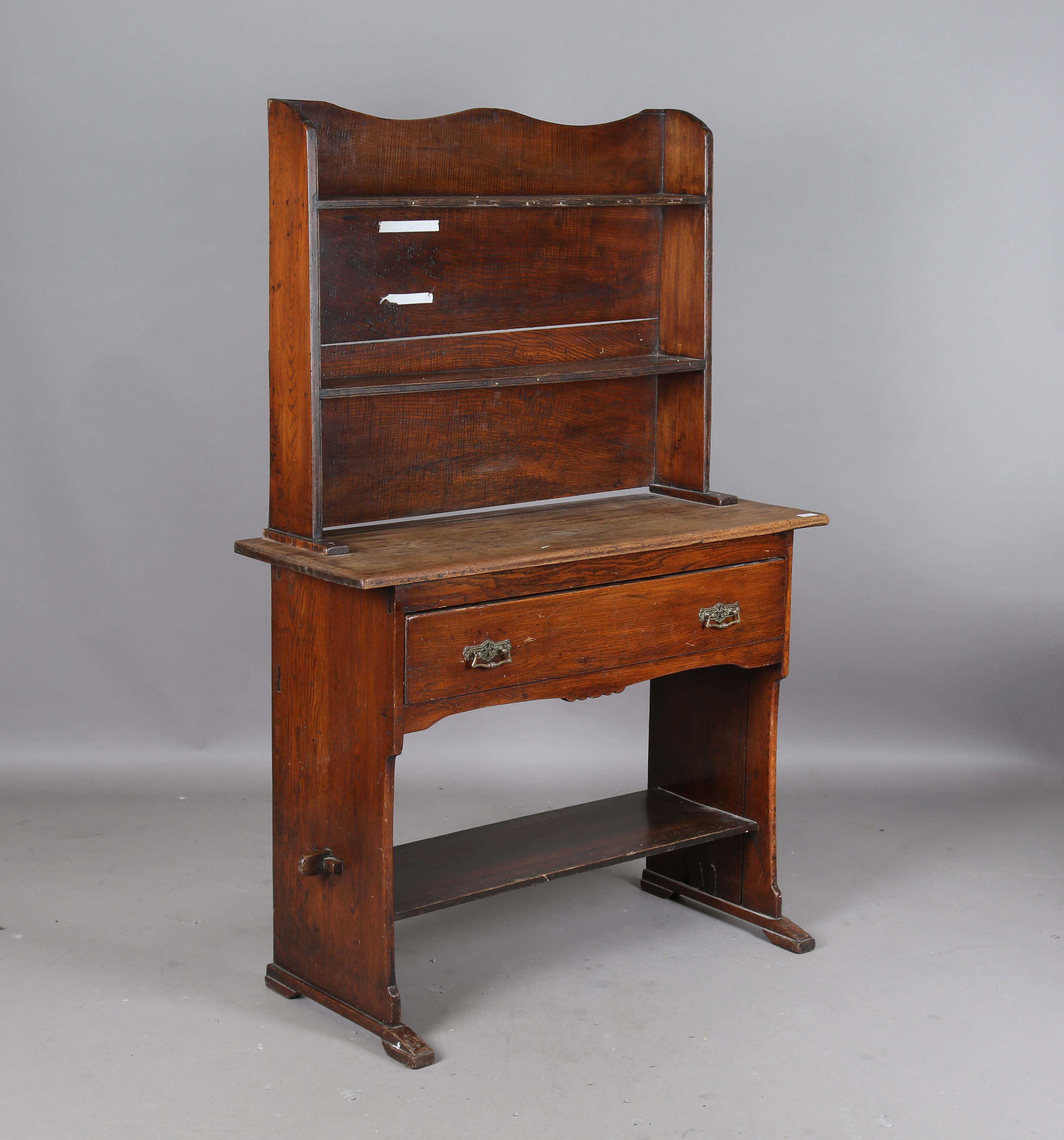 An early 20th century Arts and Crafts oak dresser, the base with peg jointed sides, height 157cm, width 107cm, depth 40cm.