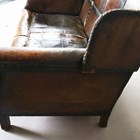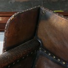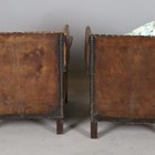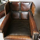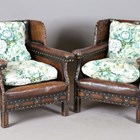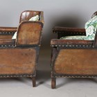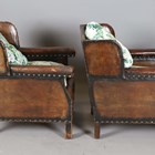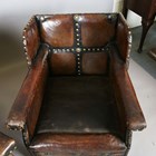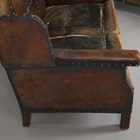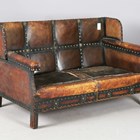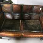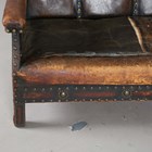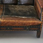 An early 20th century Arts and Crafts style brown leather and brass studded three-piece suite, comprising a wing back settee, height 80cm, width 142cm, and a pair of armchairs, height 80cm, width 76cm.
