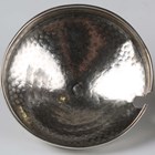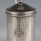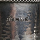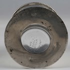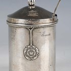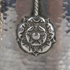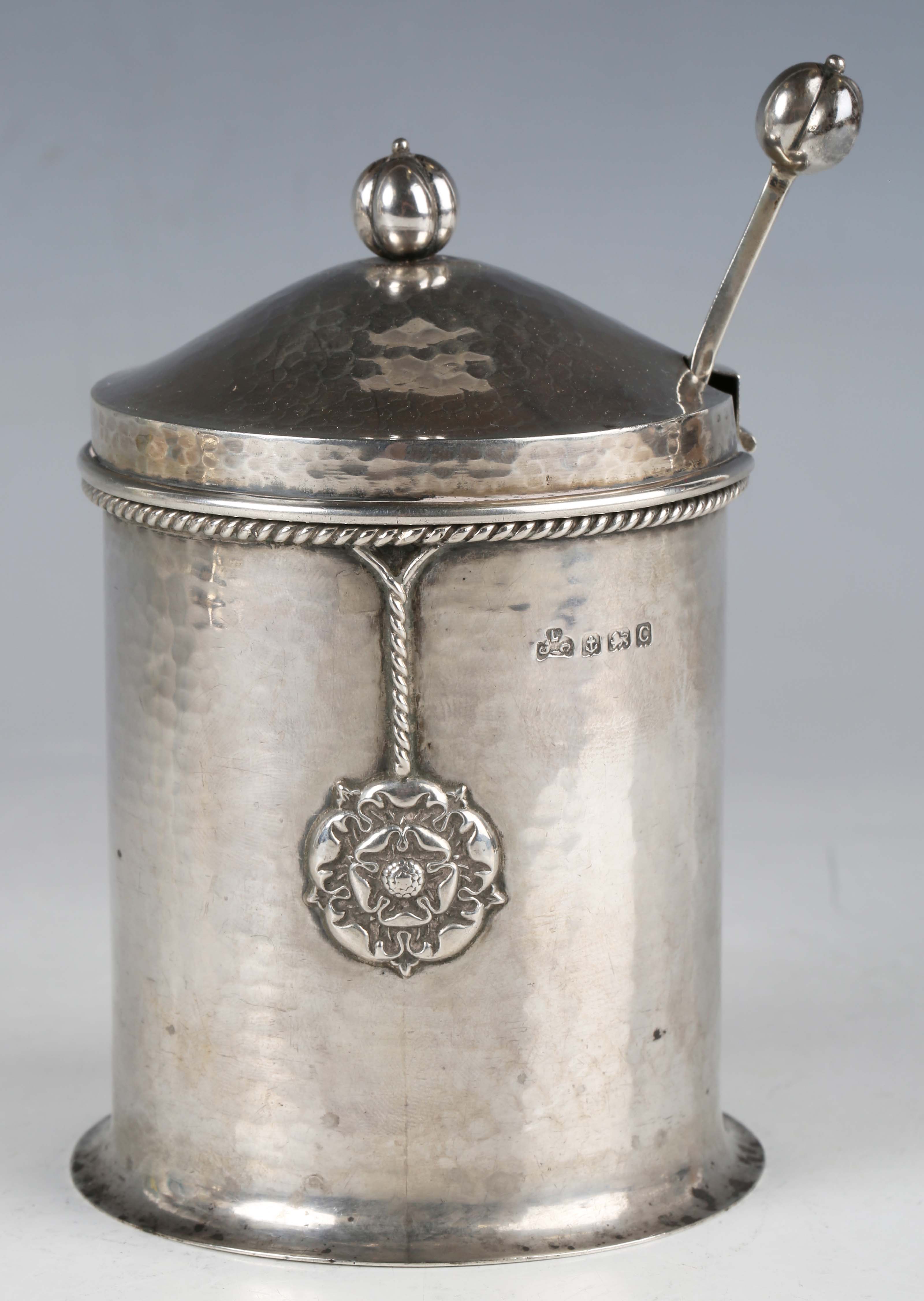 An early 20th century Arts and Crafts silver preserve pot and spoon, the body with overall hand beaten surface and applied rosette pendants, the interior with clear glass liner, Birmingham 1927 by G.L. Connell Ltd.
