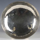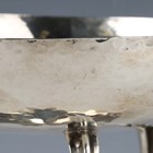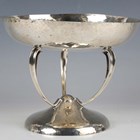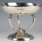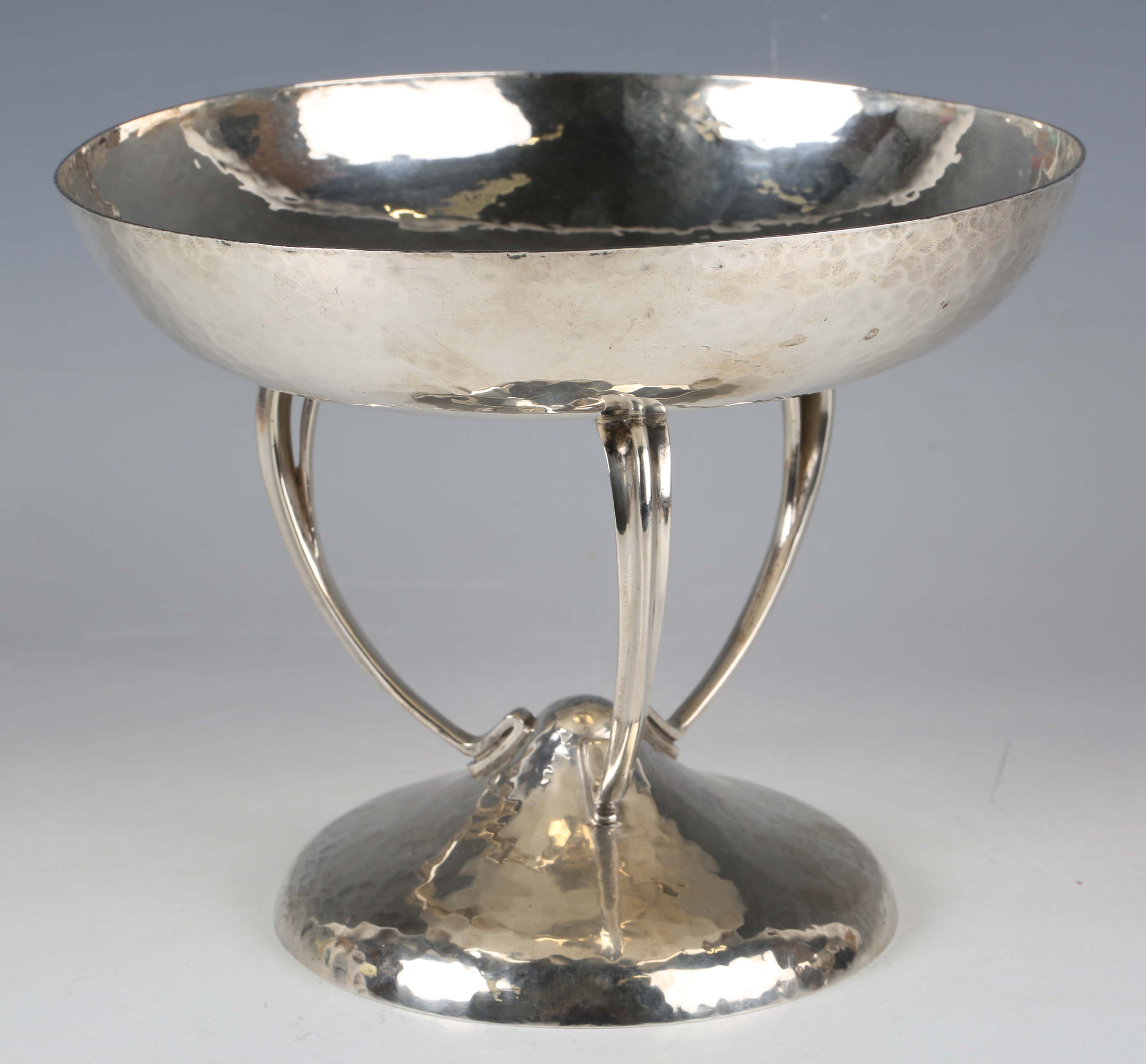 An Edwardian Arts and Crafts silver centrepiece bowl, the circular top raised on three sinuous stem supports above a domed circular foot, with overall planished finish, Glasgow 1908 by George Edward & Sons, height 15.5cm, weight 532g.
