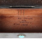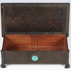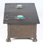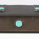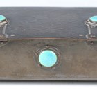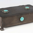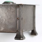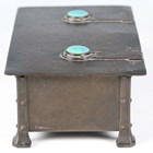 An early 20th century Arts and Crafts patinated brass box, designed by A.E. Jones, the hinged lid and front inset with blue/green glazed Ruskin cabochons, width 20cm.