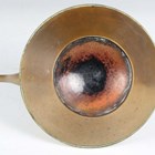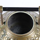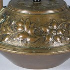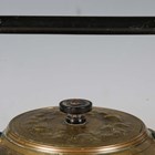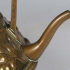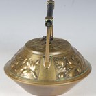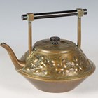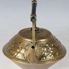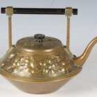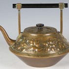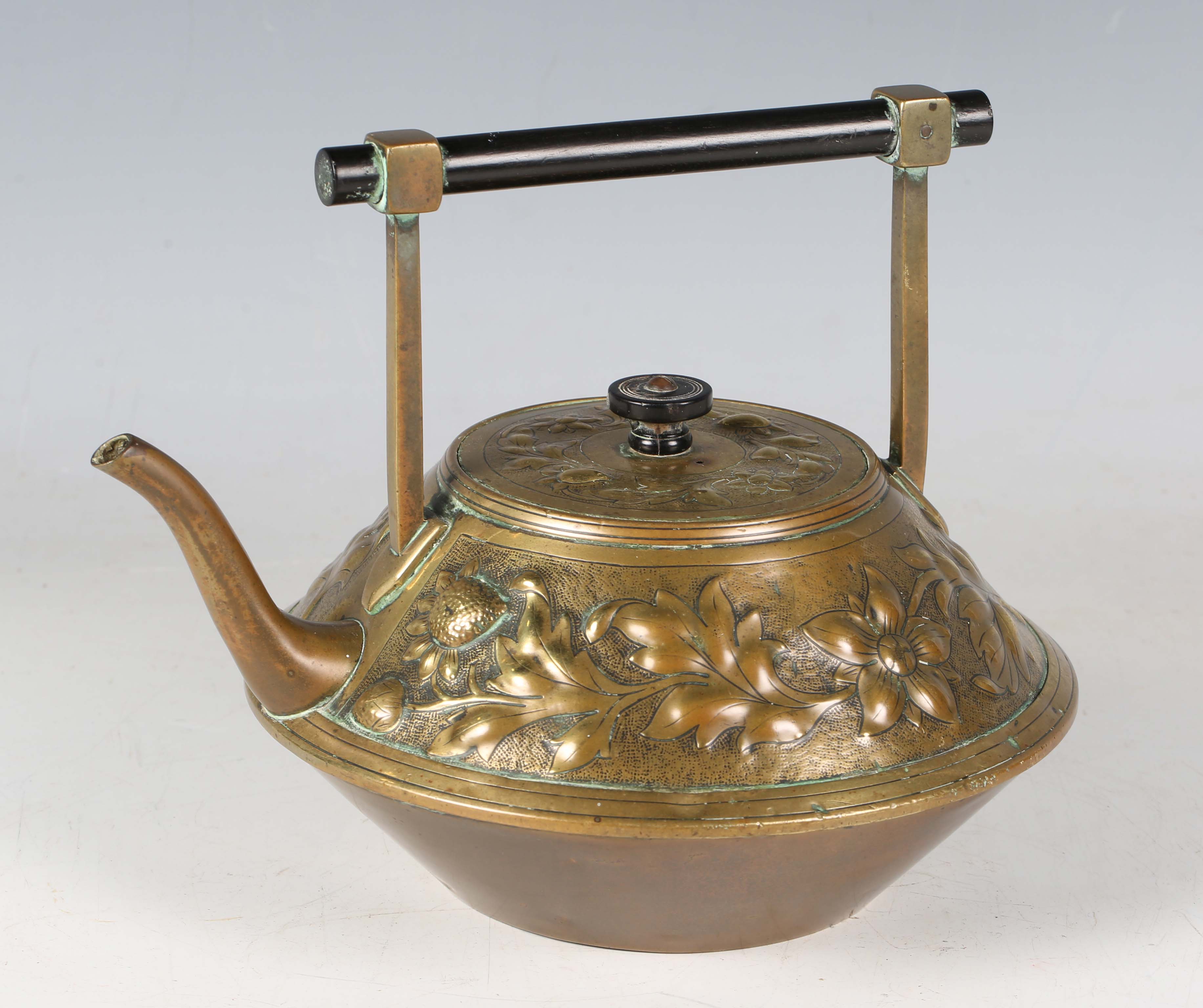 A late Victorian Aesthetic Movement brass kettle, circa 1883, in the manner of Christopher Dresser, fitted with an angular ebonized handle, the body chased with flowers, bearing lozenge registration mark, height 17cm.