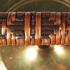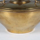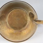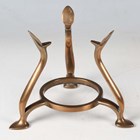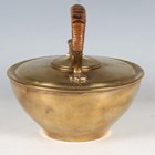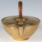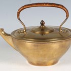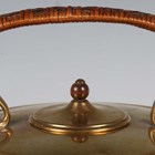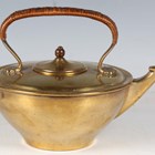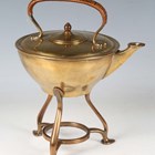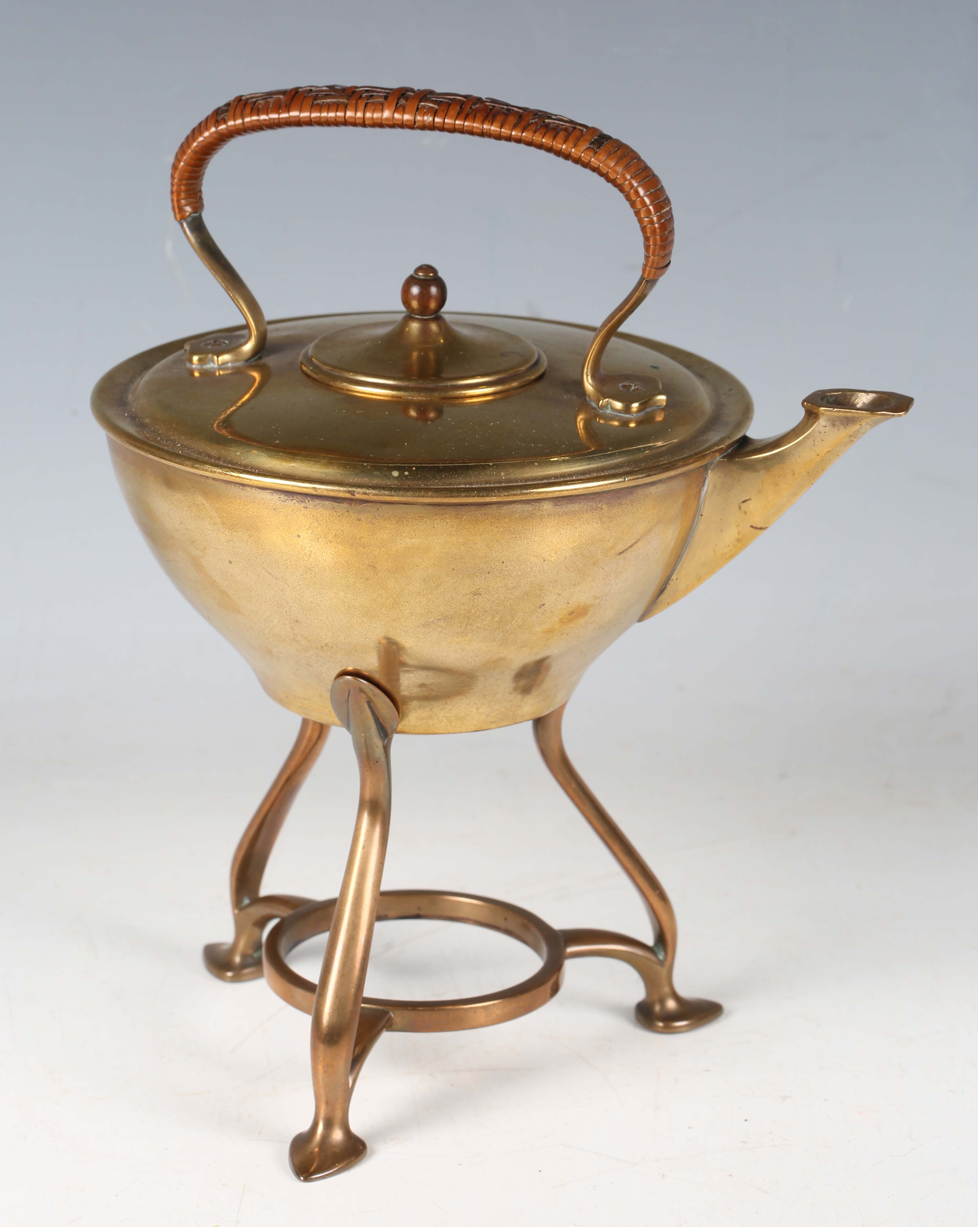 A late Victorian Aesthetic Movement brass kettle and heater stand by W.A.S. Benson, with wicker-bound handle and bearing maker's stamp to underside, height 26cm.