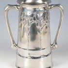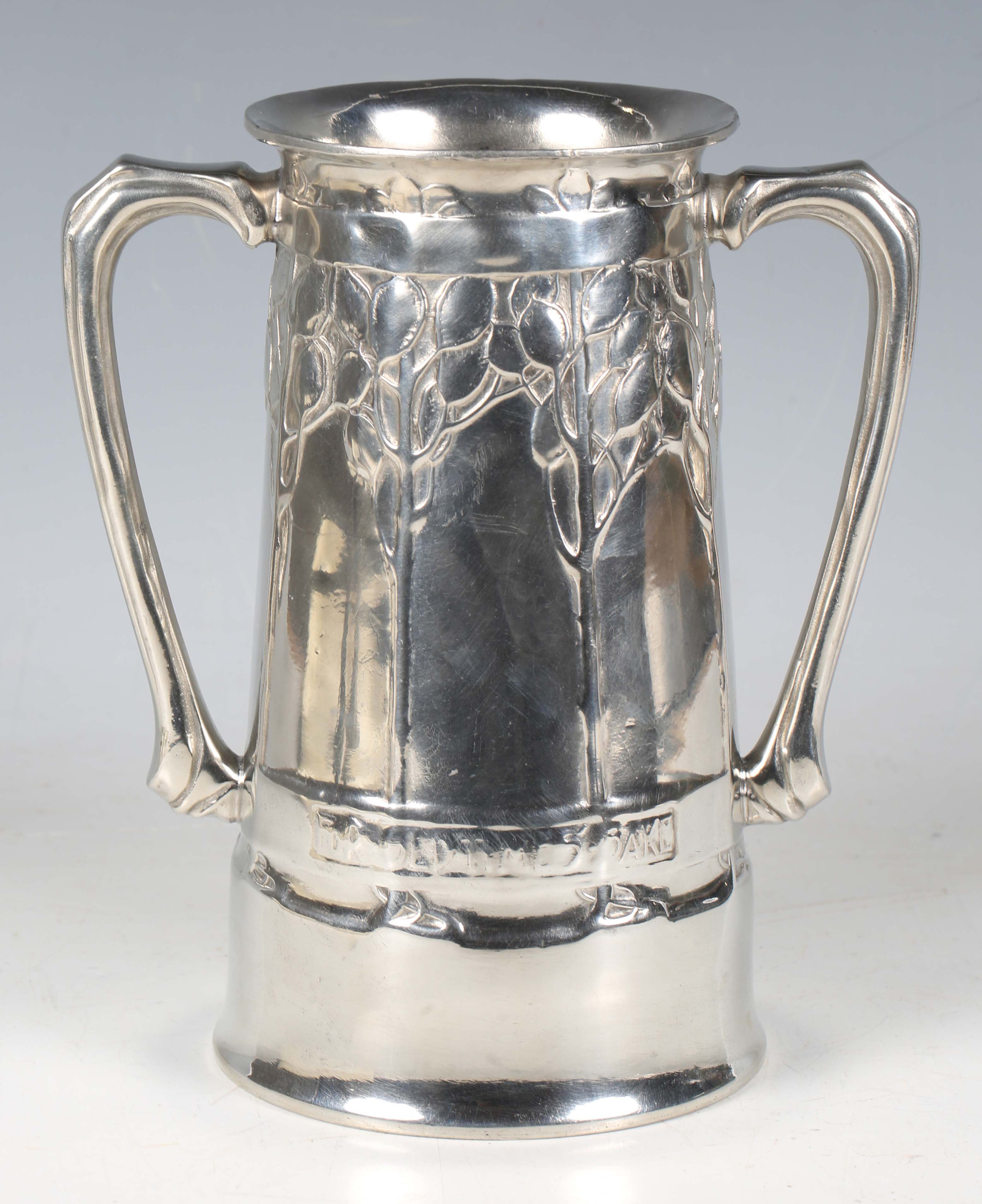 A Liberty & Co 'Tudric' pewter two-handled vase, model number '010', designed by David Veasey, decorated in low relief with a band of honesty above a motto 'For Old Times Sake', makers' marks and model number to underside, height 20.4cm.