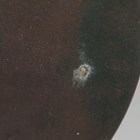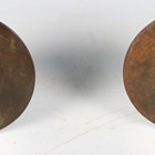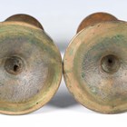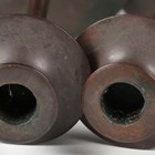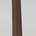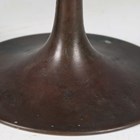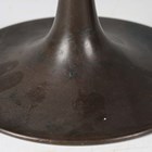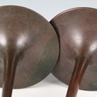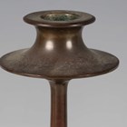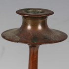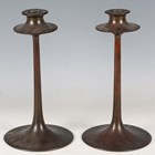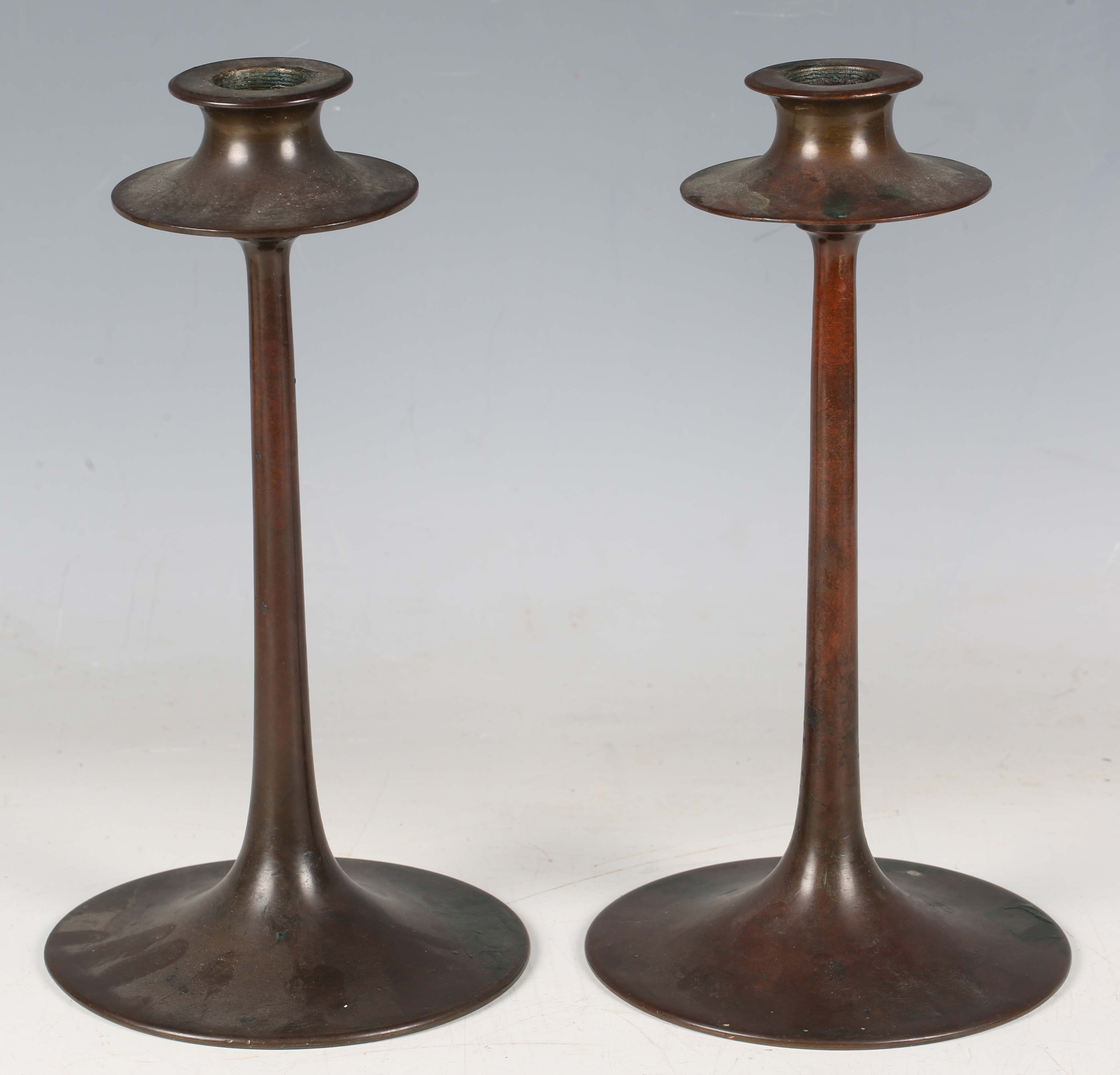 A pair of Arts and Crafts style brown patinated brass candlesticks with shaped nozzles and flared circular bases, height 25cm.