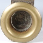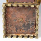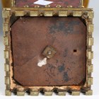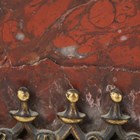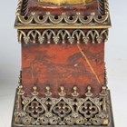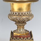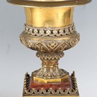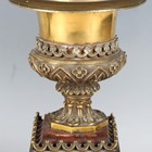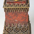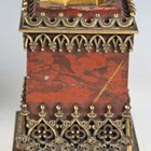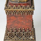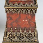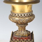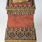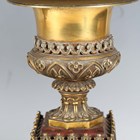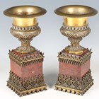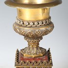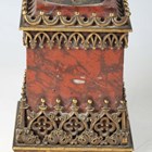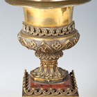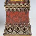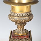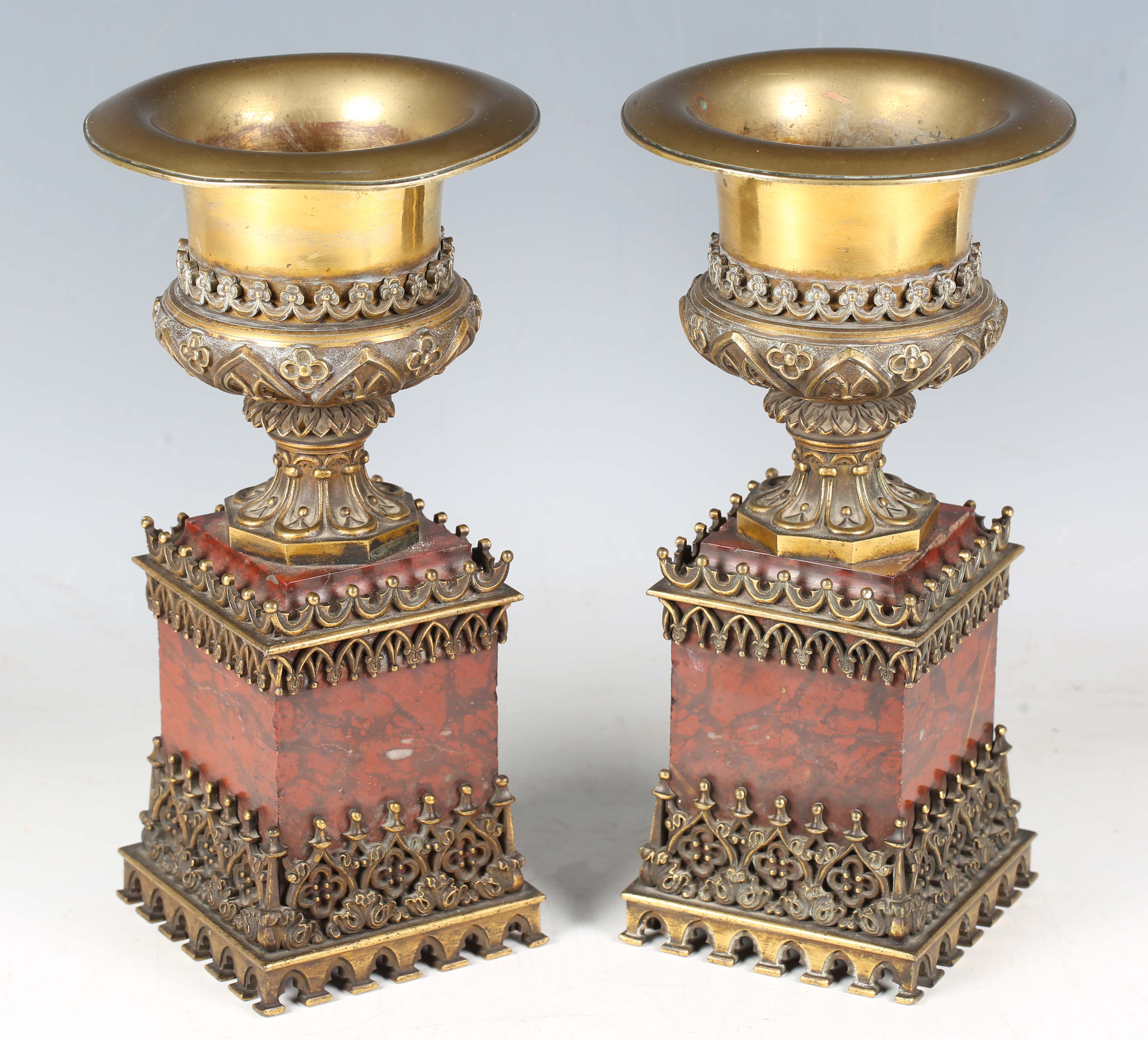 A pair of late Victorian Gothic Revival gilt bronze and rouge marble ornamental urns, in the manner of William Burgess, each urn cast with quatrefoils and arches above similarly ornamented pedestals, height 26.5cm.