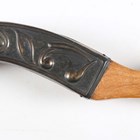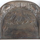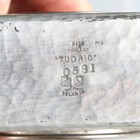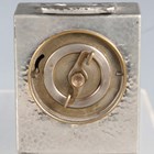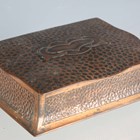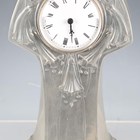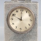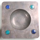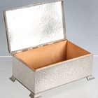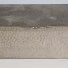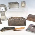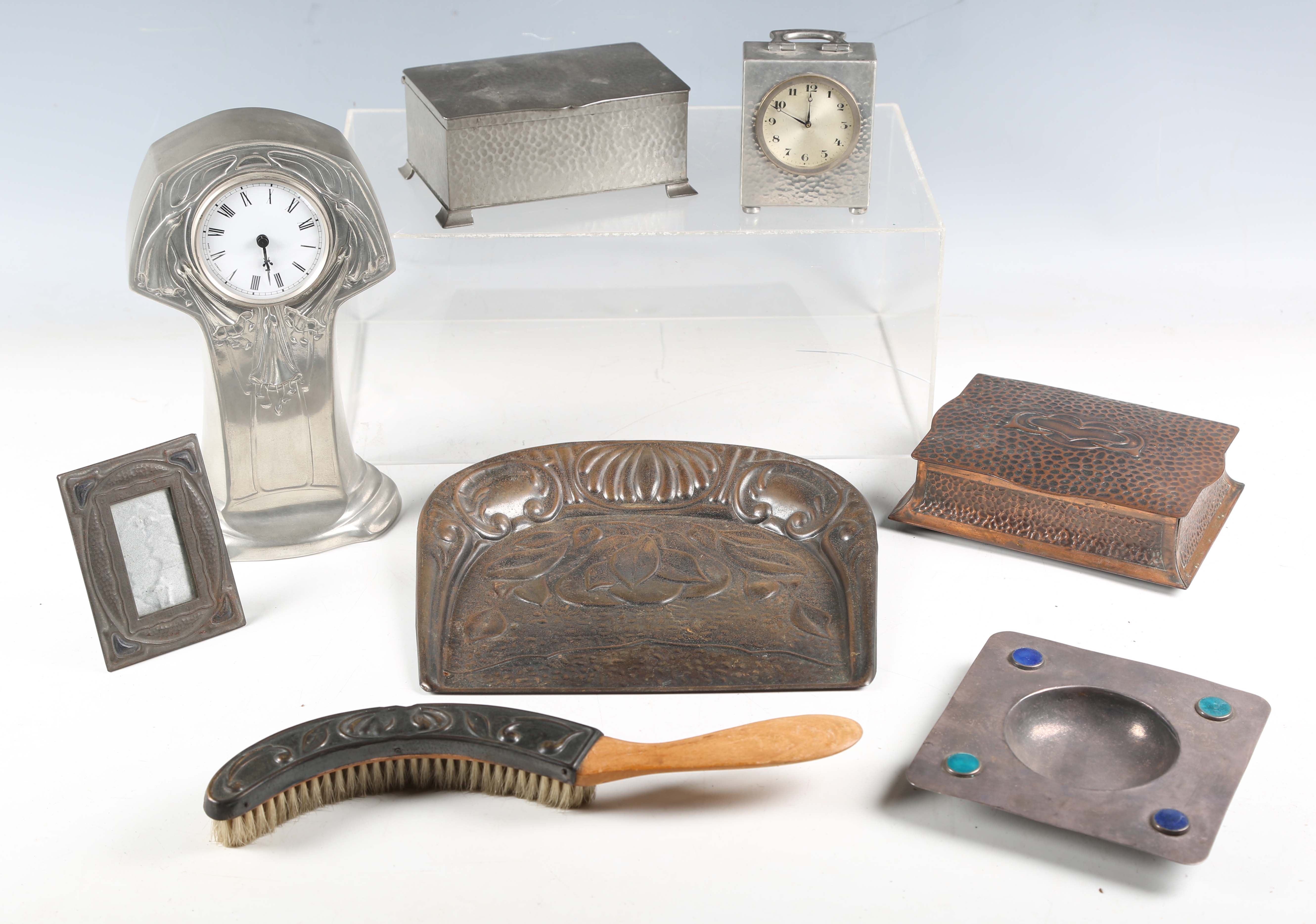 A group of Arts and Crafts metalwares, including a Liberty & Co 'Tudric' pewter timepiece, model No. '0581', a plated square dish inset with four enamelled cabochons, width 14cm, two boxes, a crumb scoop and brush, a frame and a modern Kayserzinn clock.