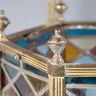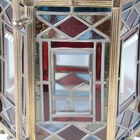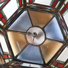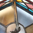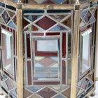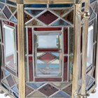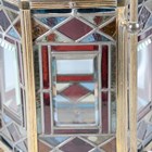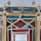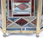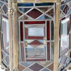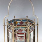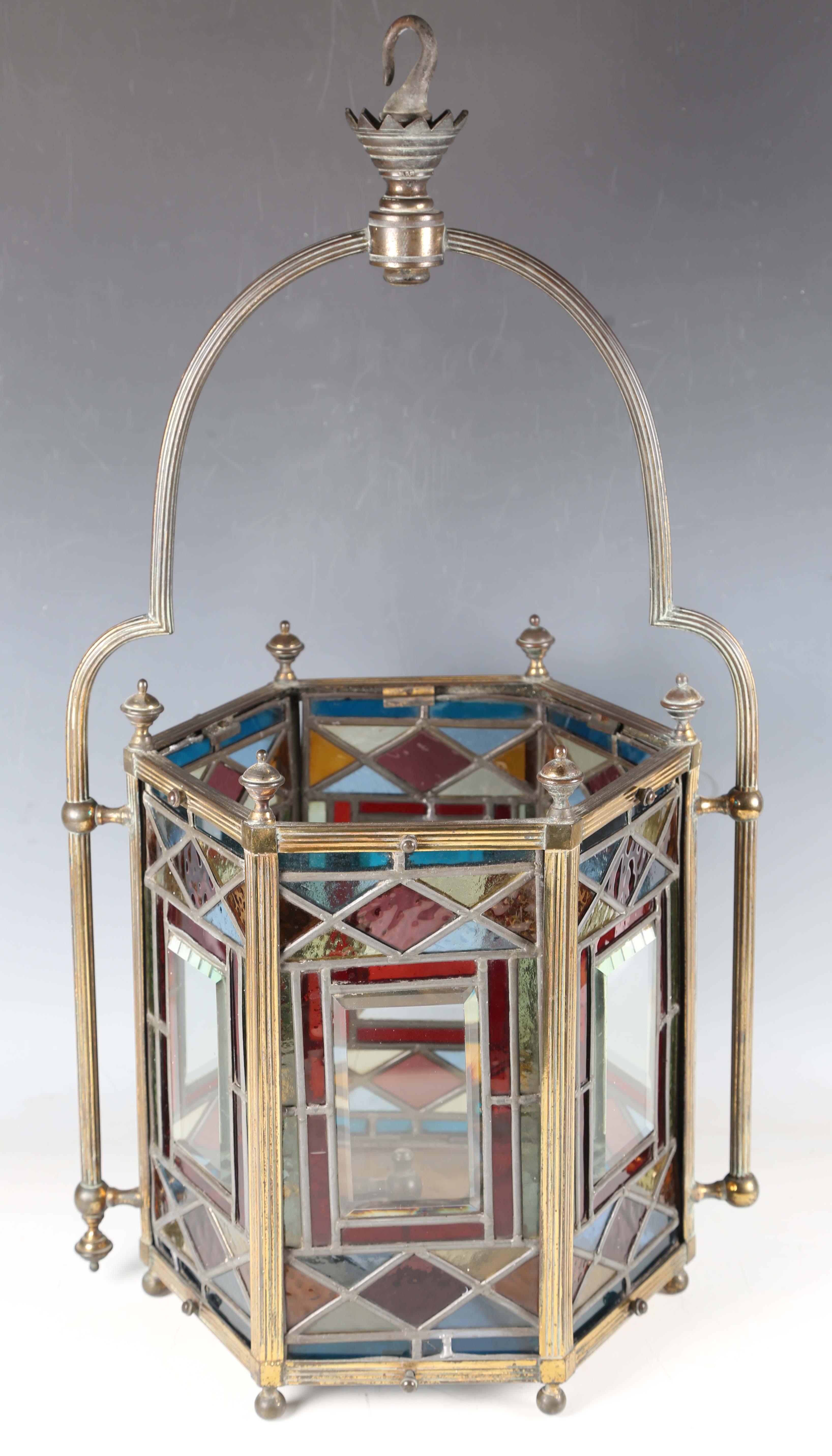 A Victorian Aesthetic Movement gilt brass framed leaded and stained glass hexagonal hall lantern, still retaining original gas fitting, height 67cm, width 36cm.