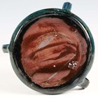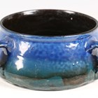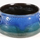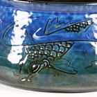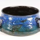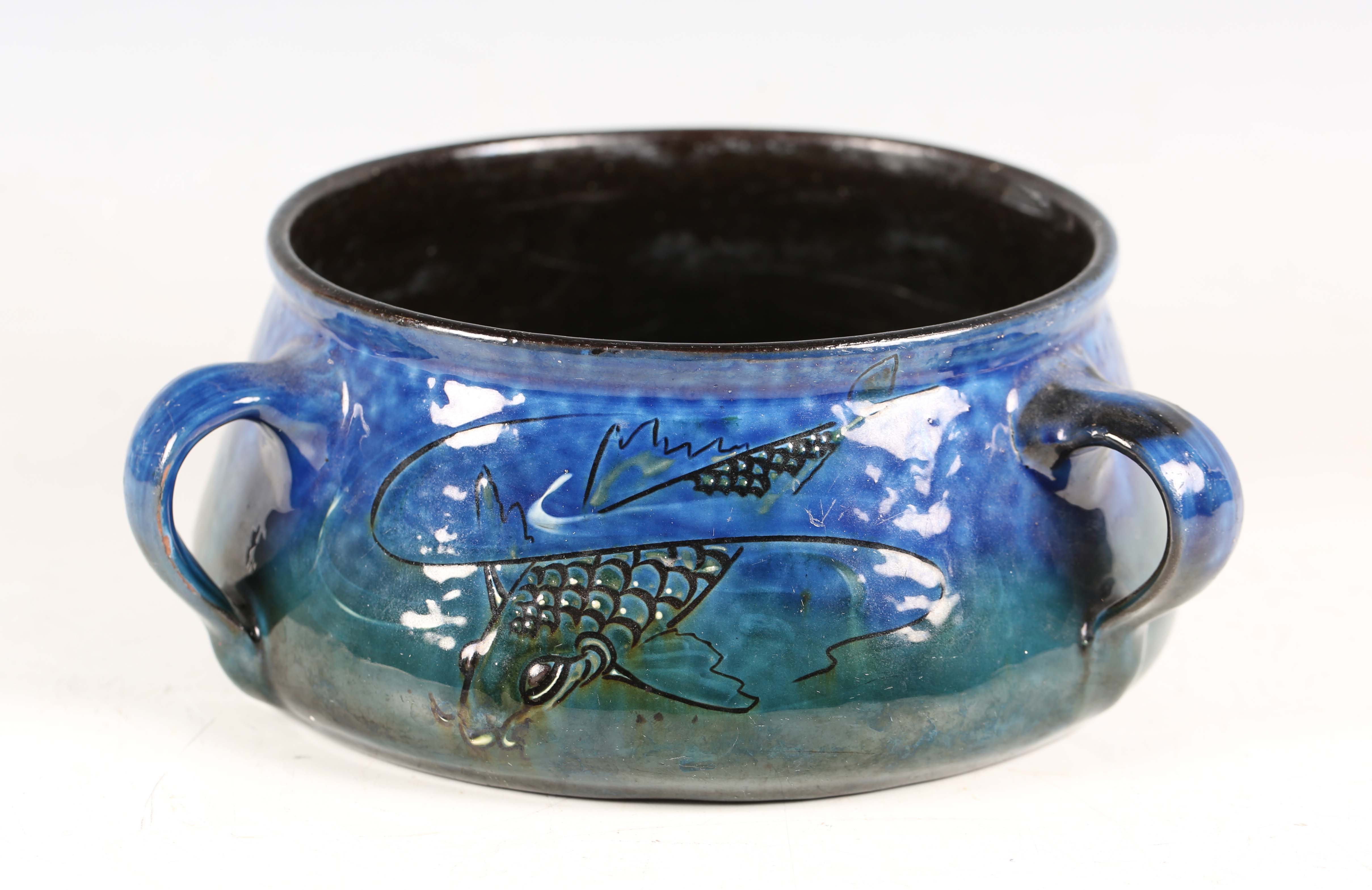 An early 20th century Brannam Barum Pottery circular bowl, made for Liberty & Co, the shaded blue/green glazed body incised with a fish, applied with three loop handles, impressed marks to base, diameter of top rim excluding handles 14cm.