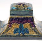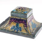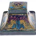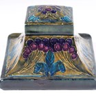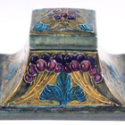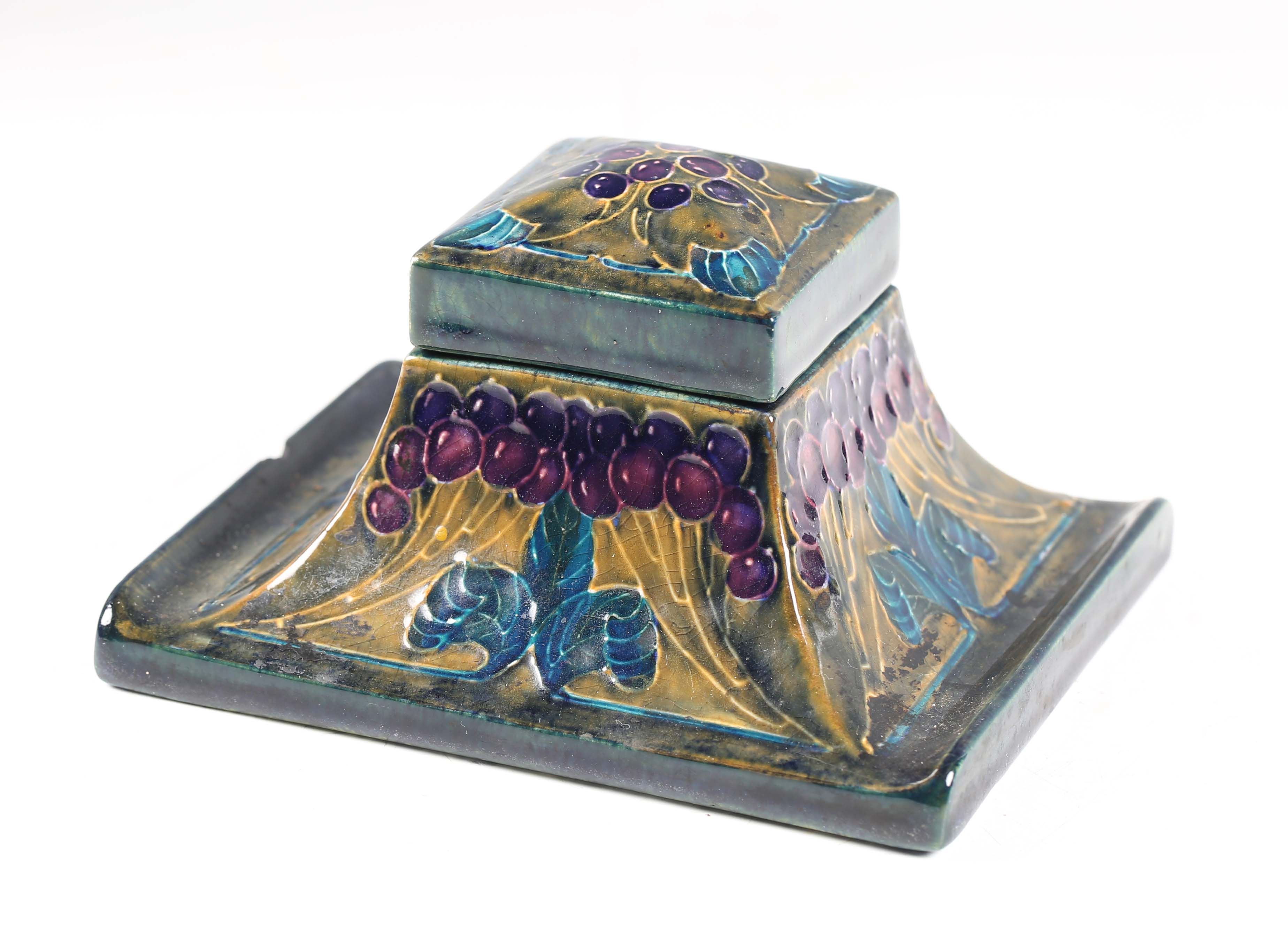 A late 19th/early 20th century S. Hancock & Sons Morrisware inkwell and cover, designed by George Cartlidge, of rectangular shape, decorated with panels of berried foliage against a mottled green ground, model No. C53-2, green printed and painted marks to base, length 13cm (small chip to side edge).