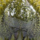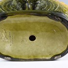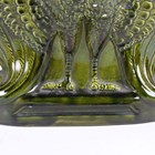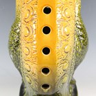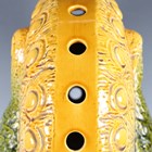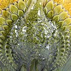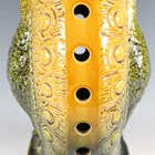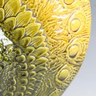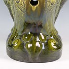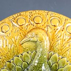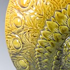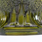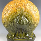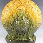 A large Ault pottery Peacock Vase, designed by Christopher Dresser, model No. 358, of flattened fan shape moulded to each side with a peacock, its tail feathers terminating in fifteen circular apertures around the top edge, glazed in mustard yellow to green, relief and impressed marks to base, height 42cm (minor faults).