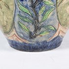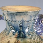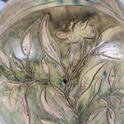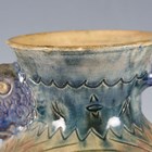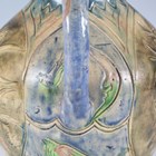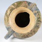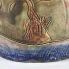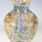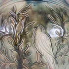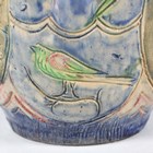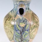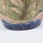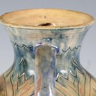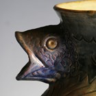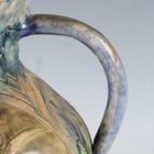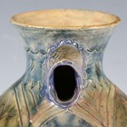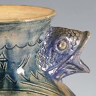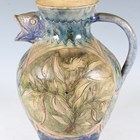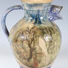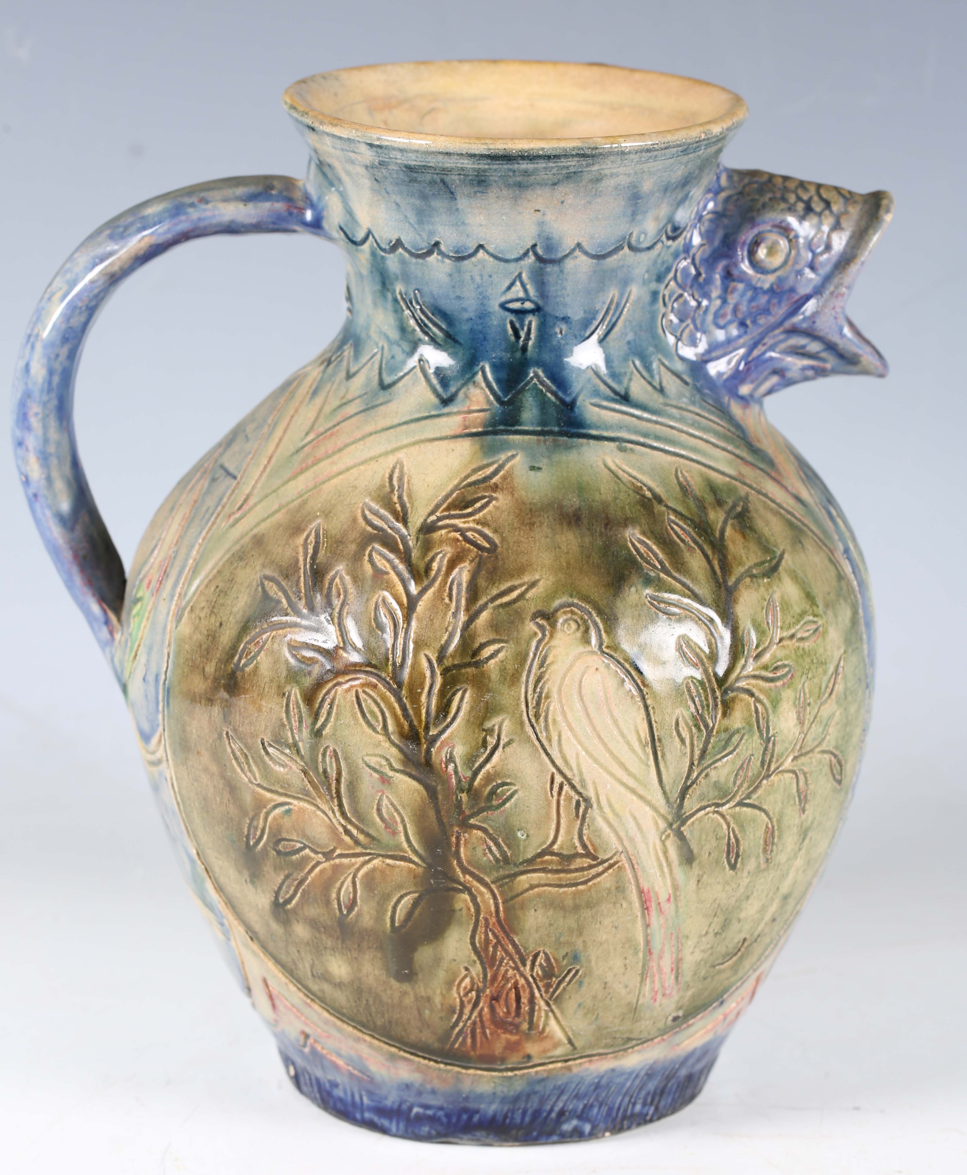 A late 19th century art pottery jug, probably Belgian, the pierced spout modelled as a fish head, the ovoid body incised with a bird and foliage, height 25cm.