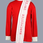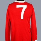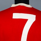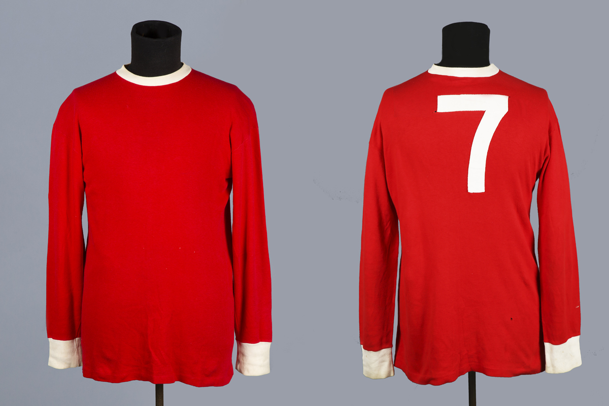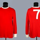 A George Best red and white No. 7 Real Madrid v Manchester United 1968 European Cup semi-final second leg match-worn shirt, bearing 'Umbro Aztec Jersey' label, with crew neck collar, together with a Manchester United towel that the shirt was wrapped in when it was passed to the current owner by George Best himself. Note: the current owner of this shirt regularly travelled to Old Trafford to watch her beloved Manchester United play, along with the London & District Supporters Club. Mingling with the players before the games, she became 'pally' with David Sadler, who lodged with George and would chat with both of them before matches. Having watched the first leg of the semi-final, she also travelled to Madrid to watch the second leg, having phoned George the week before to ask for his shirt after the game. Meeting him at the team hotel as he stepped off the coach, he shoved a soaking wet bundle into her arms before Jack Crompton (kit man) could see him give the shirt away. The shirt is accompanied by the towel that it was wrapped in, a five page statement written by the vendor and copies of photographs taken on the day. It is worth noting that the shirt's number has been stitched quite high up on the back and footage of the game appears to verify this.