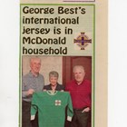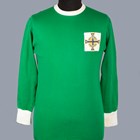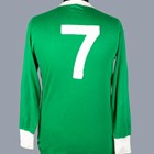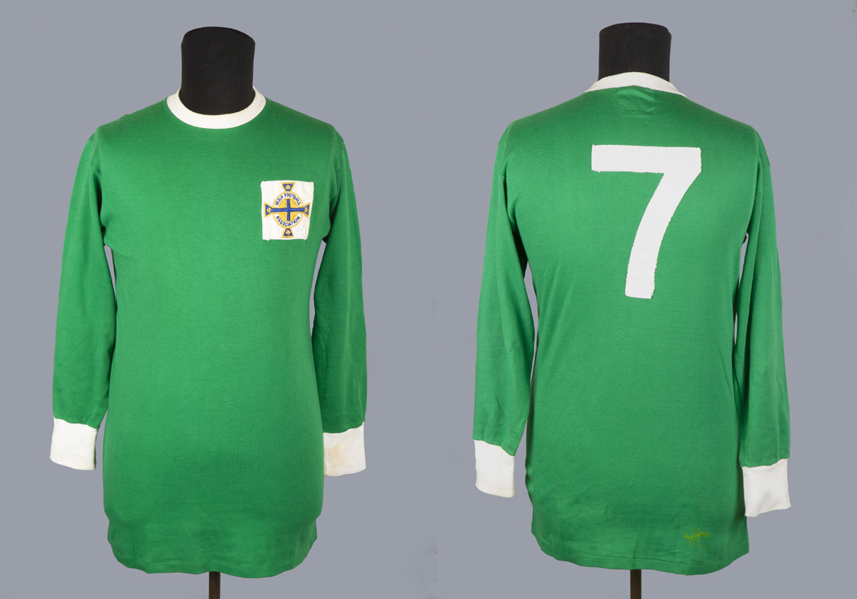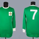 A George Best green and white No. 7 Northern Ireland reputed match-worn shirt, bearing 'The Umbro 'Real' Jersey' label, embroidered 'Irish Football Association' badge and indistinct yellow Umbro stamp, with crew neck collar and long sleeves. Note: this shirt is reputed to have been worn by George Best in the British Home Championship game against Scotland, November 25th 1964 at Hampden Park. Best scored his second international goal, opening the scoring in the 9th minute, eventually losing the game 3-2. The shirt is said to have been swapped with the Celtic striker Willie Wallace's shirt after the game. Wallace was to later become a coach at Dundee FC and this shirt was won in a Stobswell Junior Football Club gala day raffle by a member of the vendor's family. The lot is accompanied by various related newspaper cuttings. Thanks to Michael Cockcroft of the Northern Ireland Football Museum for his help in cataloguing this lot.