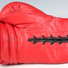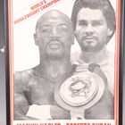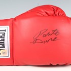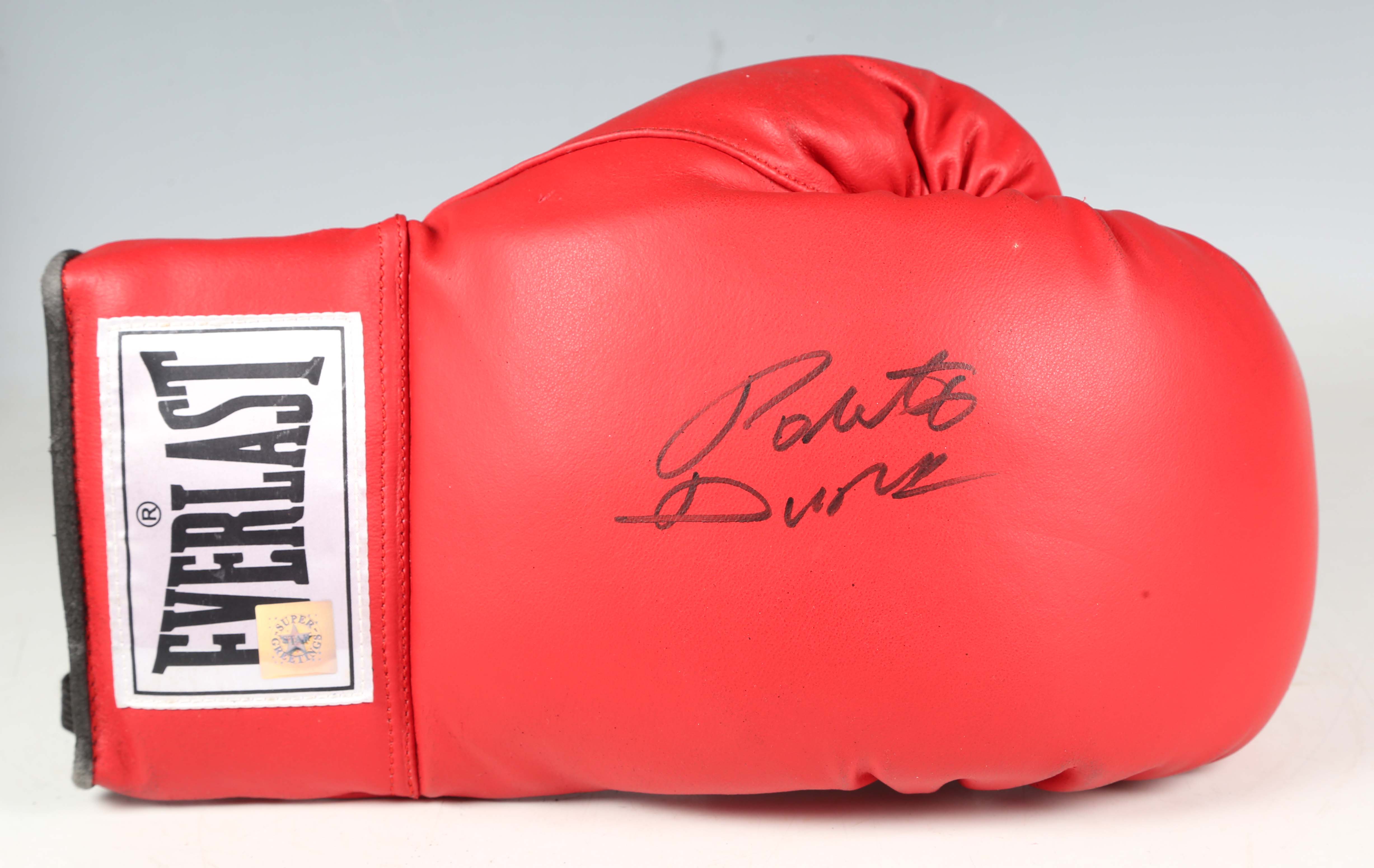 An Everlast red boxing glove, signed by Roberto Duran in black marker pen, accompanied by 'Super Star Greetings' COA and a photograph of Duran signing a glove, together with a poster for the World's Middleweight Championship fight between Marvin Hagler and Roberto Duran.
