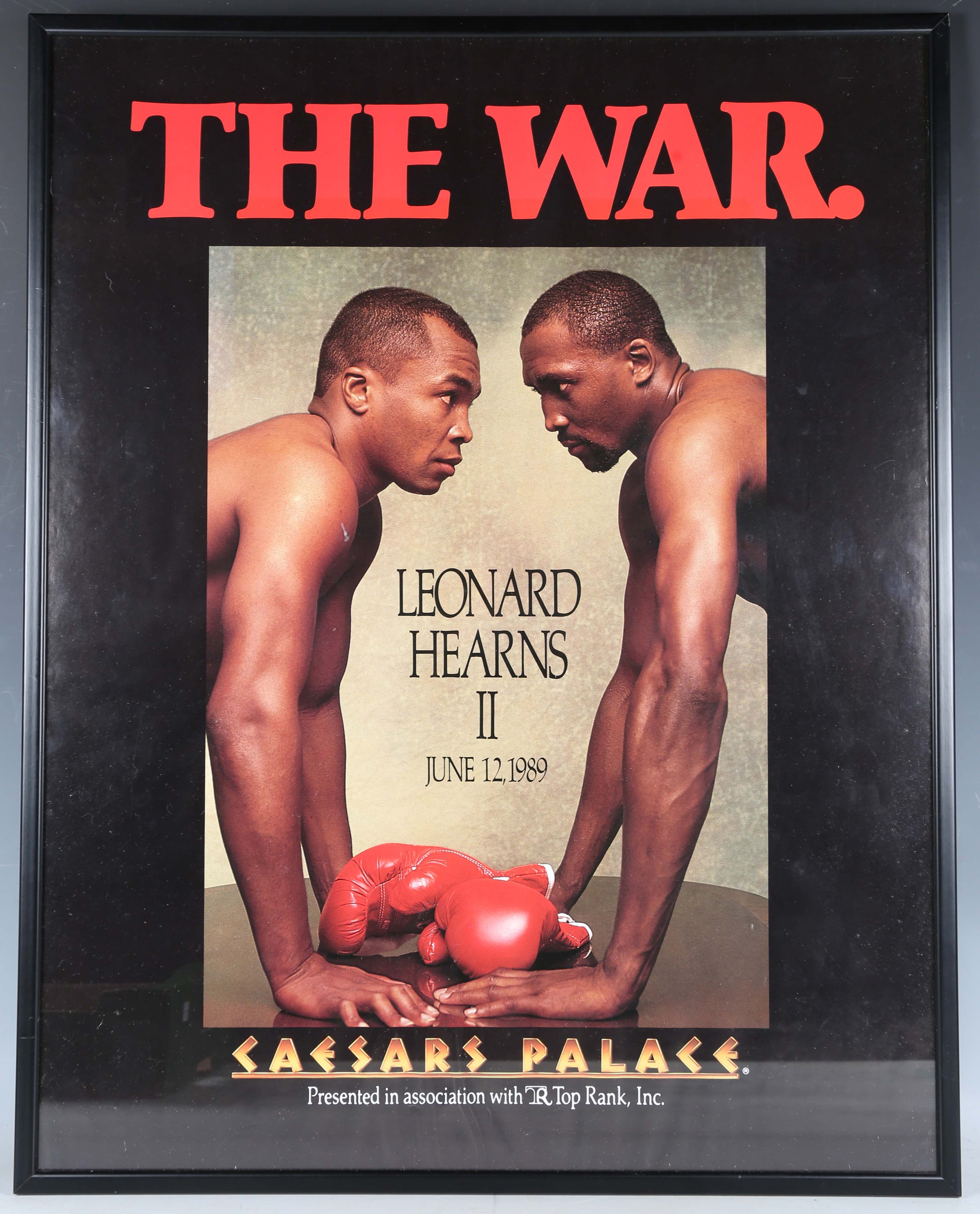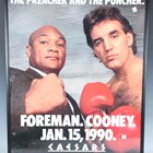 A colour printed advertising poster for Leonard v Hearns II on June 12th 1989, 70cm x 55cm, another poster for Foreman v Cooney, January 15th 1990, and a group of seven 1990s boxing programmes, ticket stubs and inner-ringside passes.