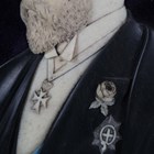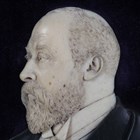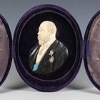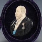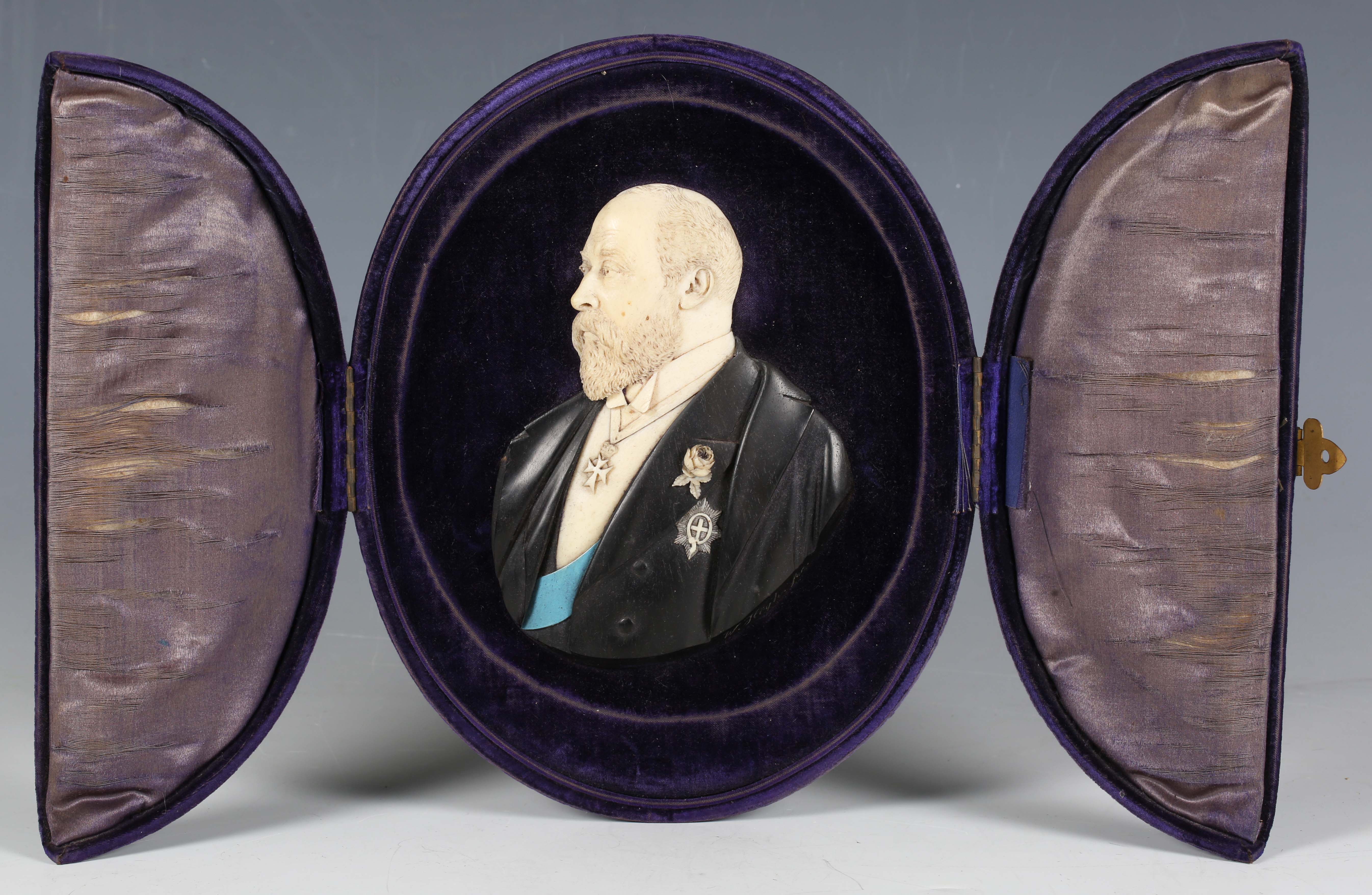 W. Hughes - an early 20th century carved ebony and ivory commemorative portrait plaque of King George V, bearing inscribed signature 'W. Hughes Fec', height 14.2cm, mounted within a period purple velvet case.