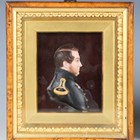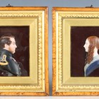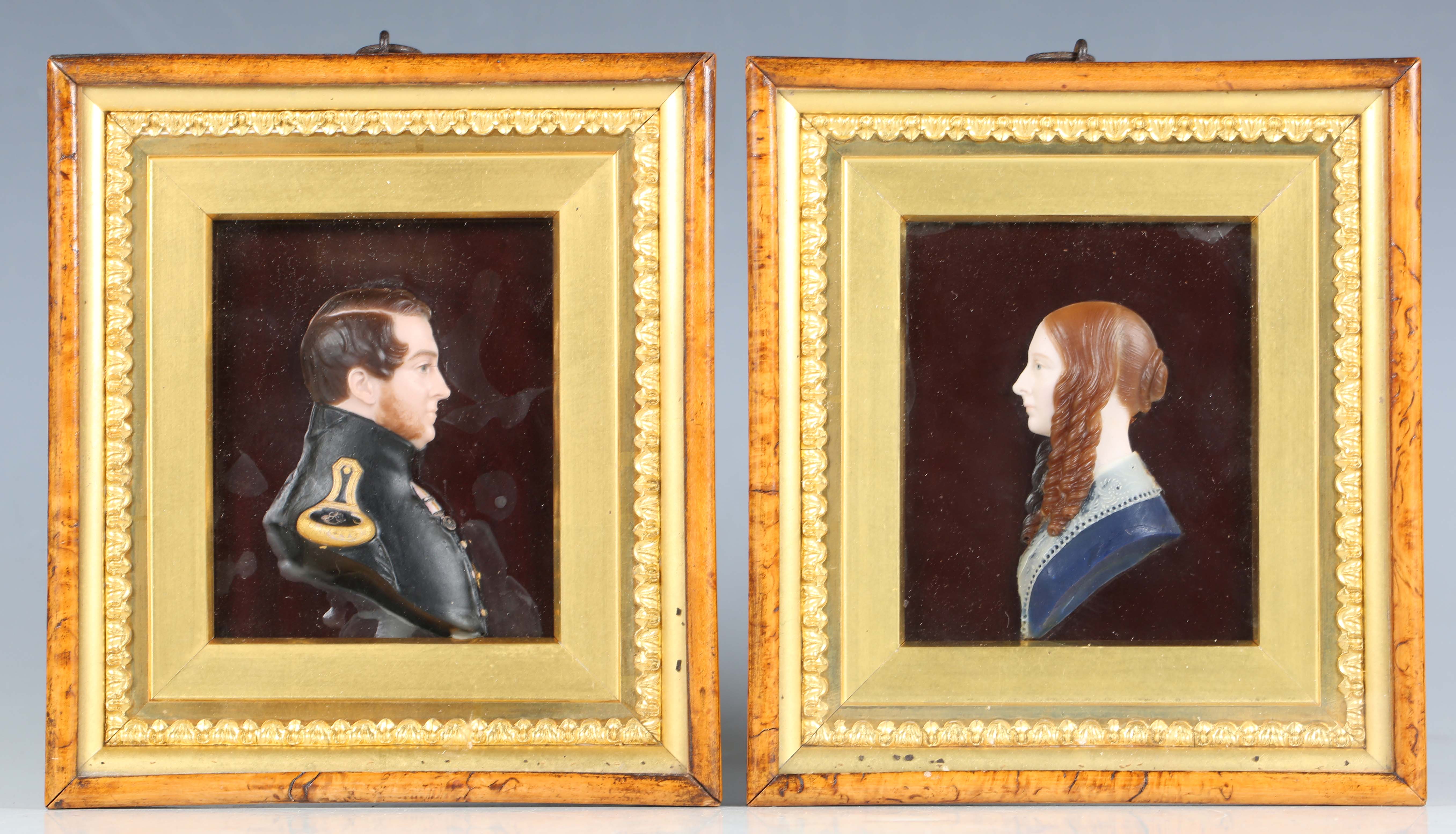 A pair of mid-Victorian coloured wax profile portraits of Brigadier General George Henry Robertson, aides-de-camp to Queen Victorian (1813-1862), and his wife Jane Newcomen (1824-1900), both mounted within gilt gesso and maple frames, 18cm x 16cm.