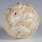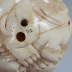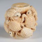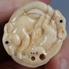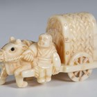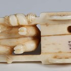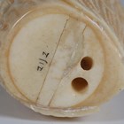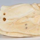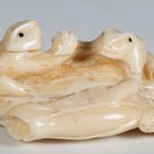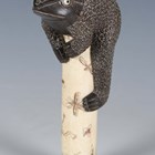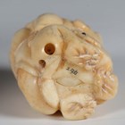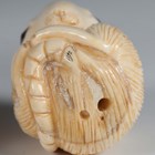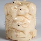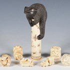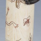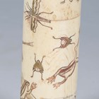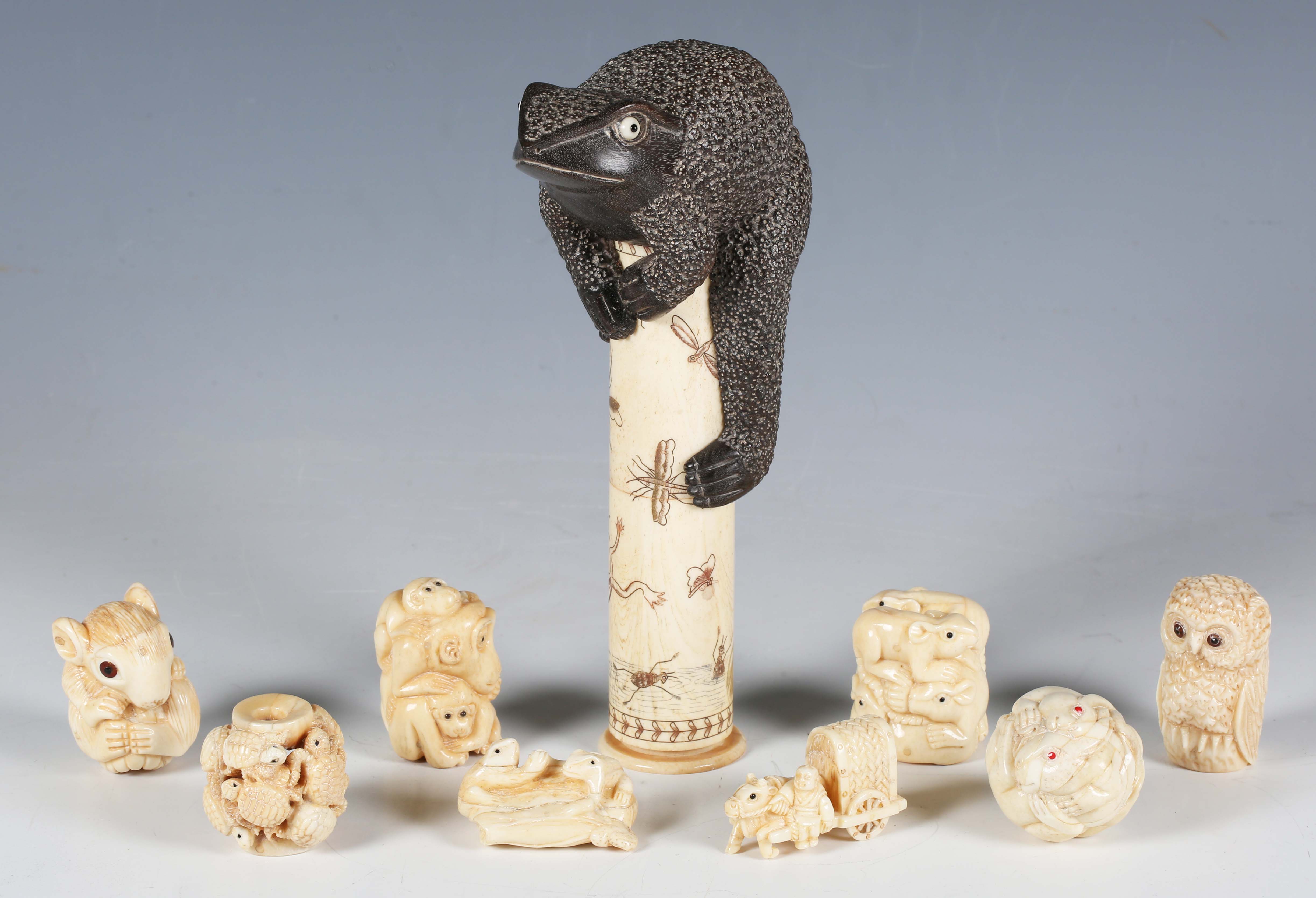 A collection of eight modern Chinese carved bone netsuke and a bone and carved horn scroll case, modelled with a large toad finial, length 19.5cm.