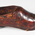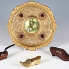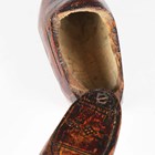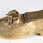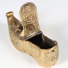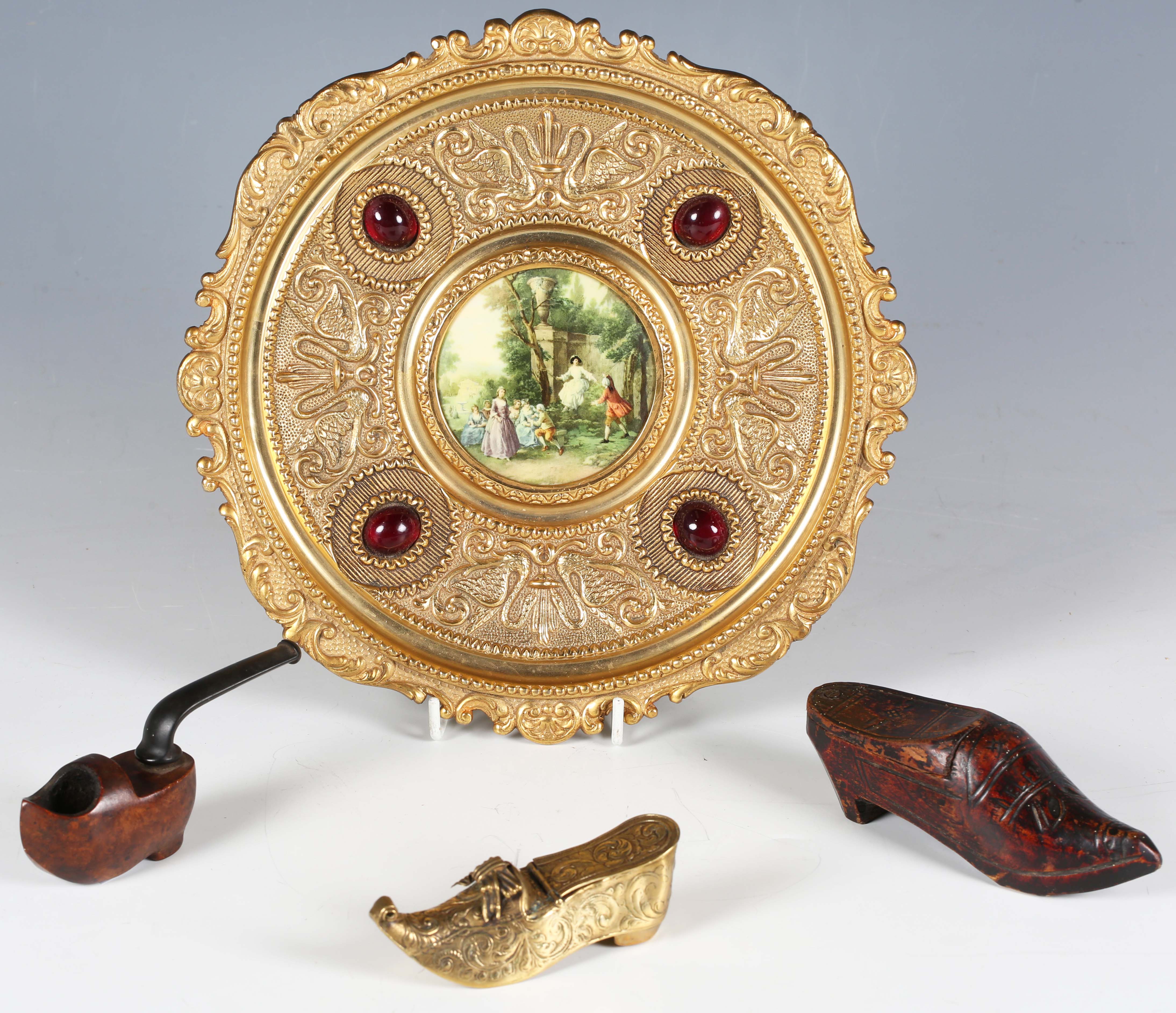A late 19th century Dutch brass snuff box modelled as a shoe, another Dutch carved softwood shoe snuff box, a small smoking pipe in the form of a shoe, and a 20th century gilt brass ornamental dish, diameter 22.5cm.