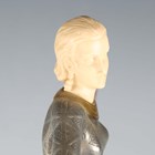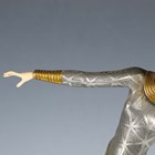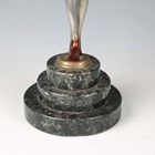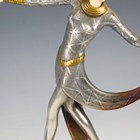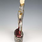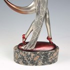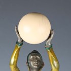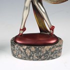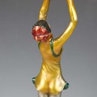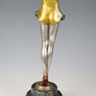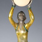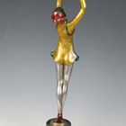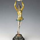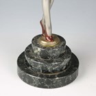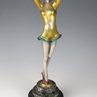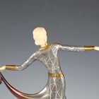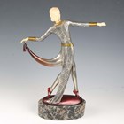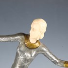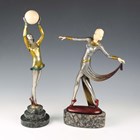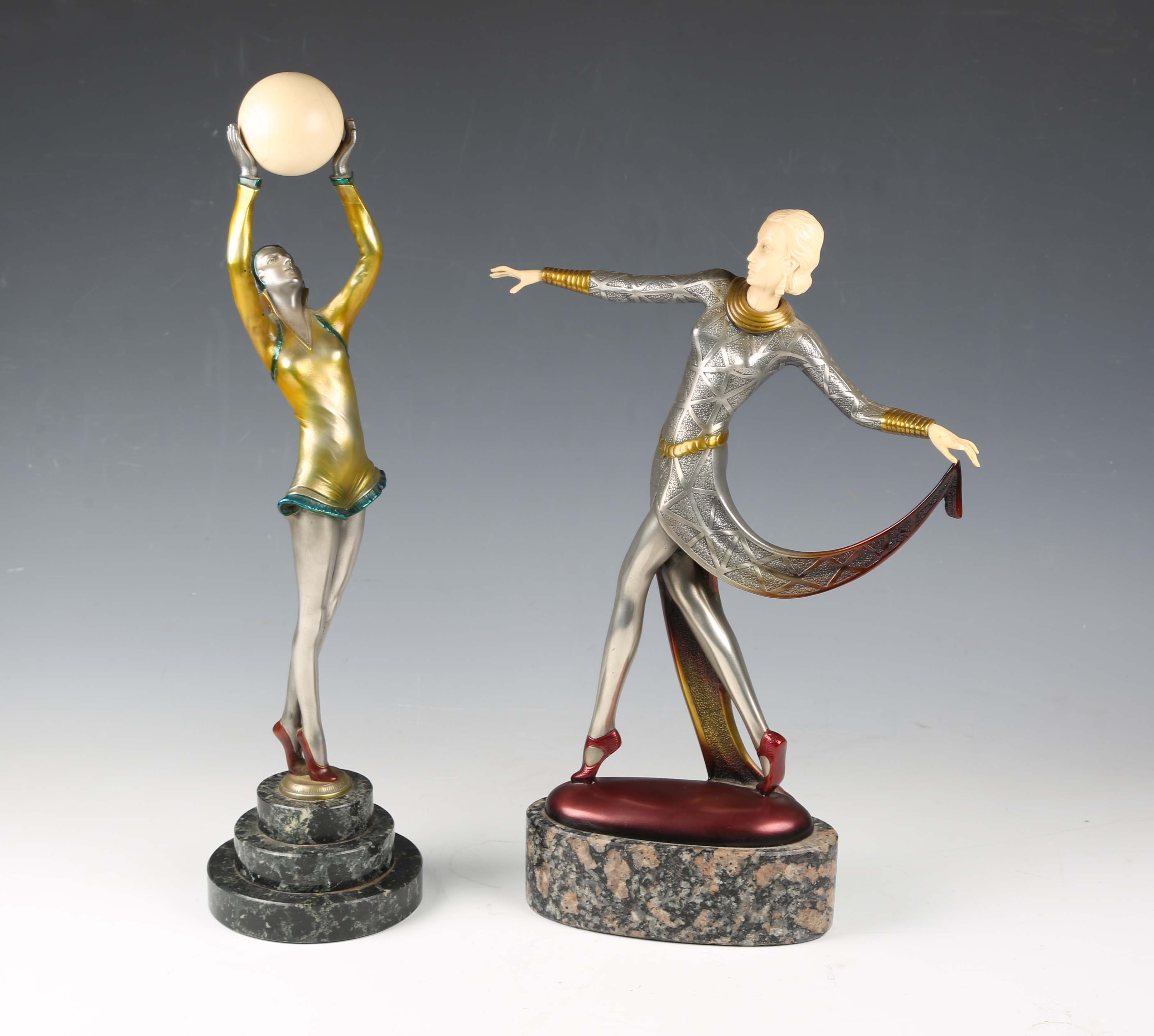 After Josef Lorenzl - a mid-20th century Art Deco style cold painted pewter figure of a dancer, raised on an oval marble plinth, height 37cm, together with another similar figure of a lady holding a ball aloft, height 43.5cm.