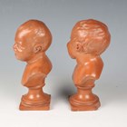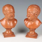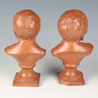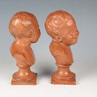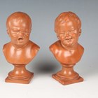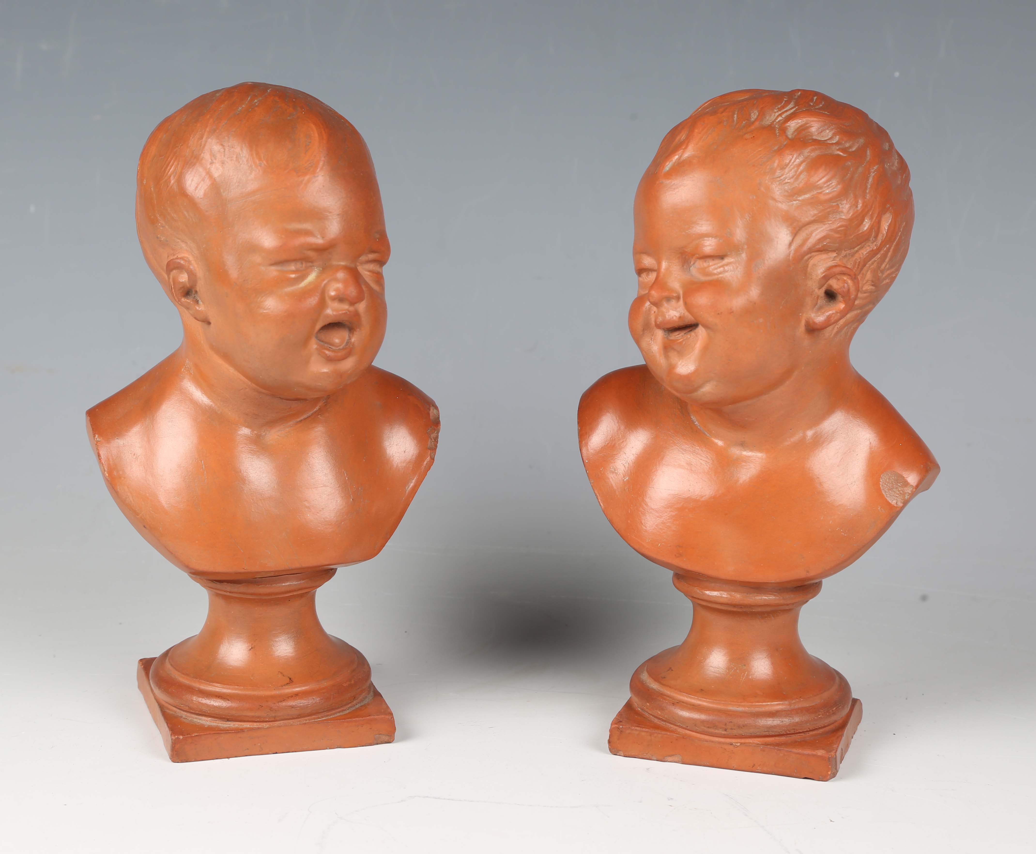 After Jean-Antoine Houdon - a pair of 19th century terracotta portrait busts of a crying and laughing baby, raised on socle bases, height 18cm (some faults).