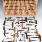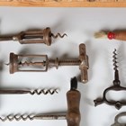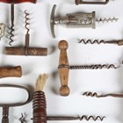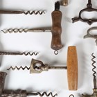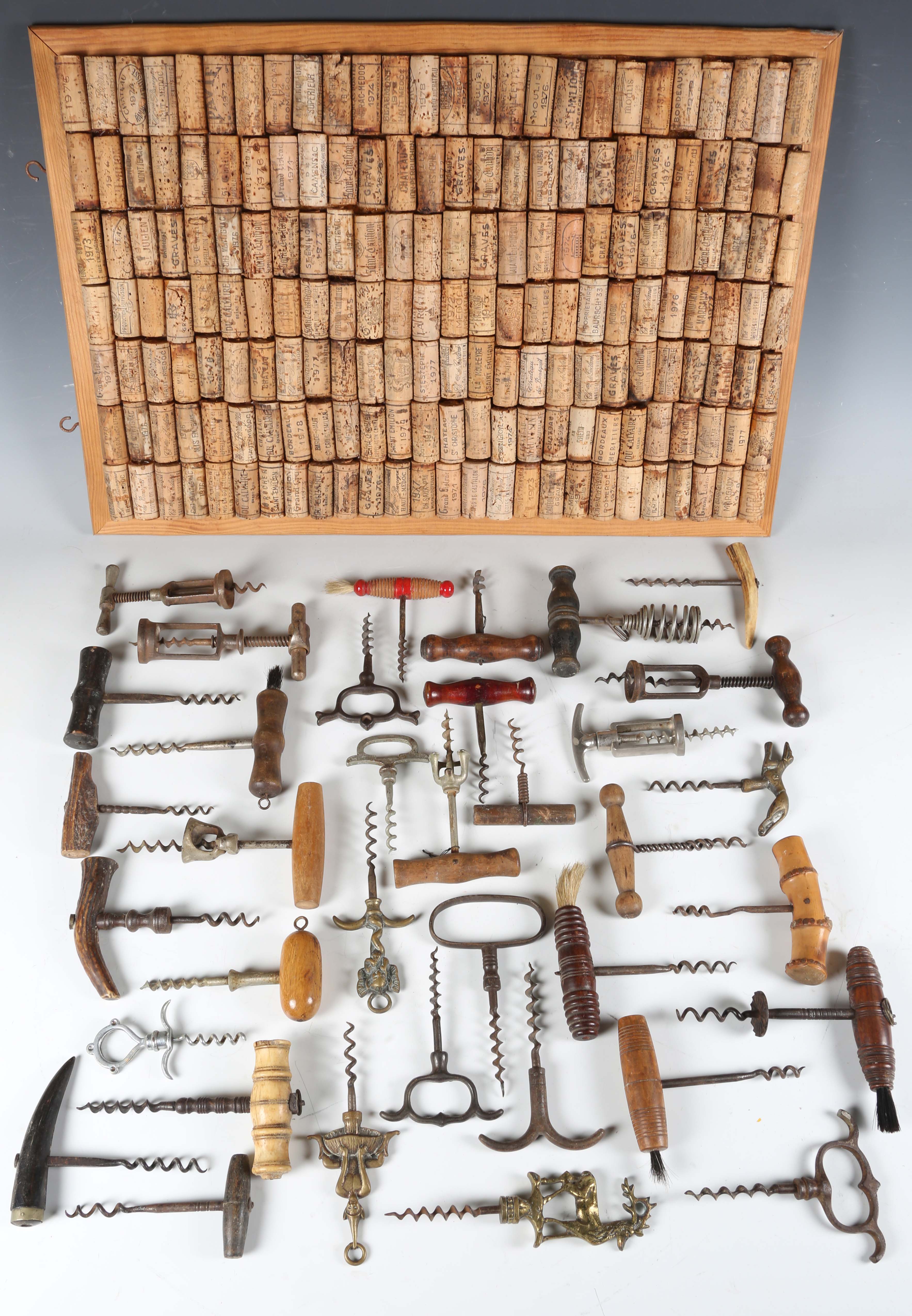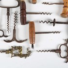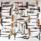 A collection of corkscrews, including various 19th century crossbar examples, eyebrow corkscrews and open barrel corkscrews.
