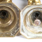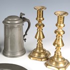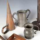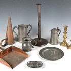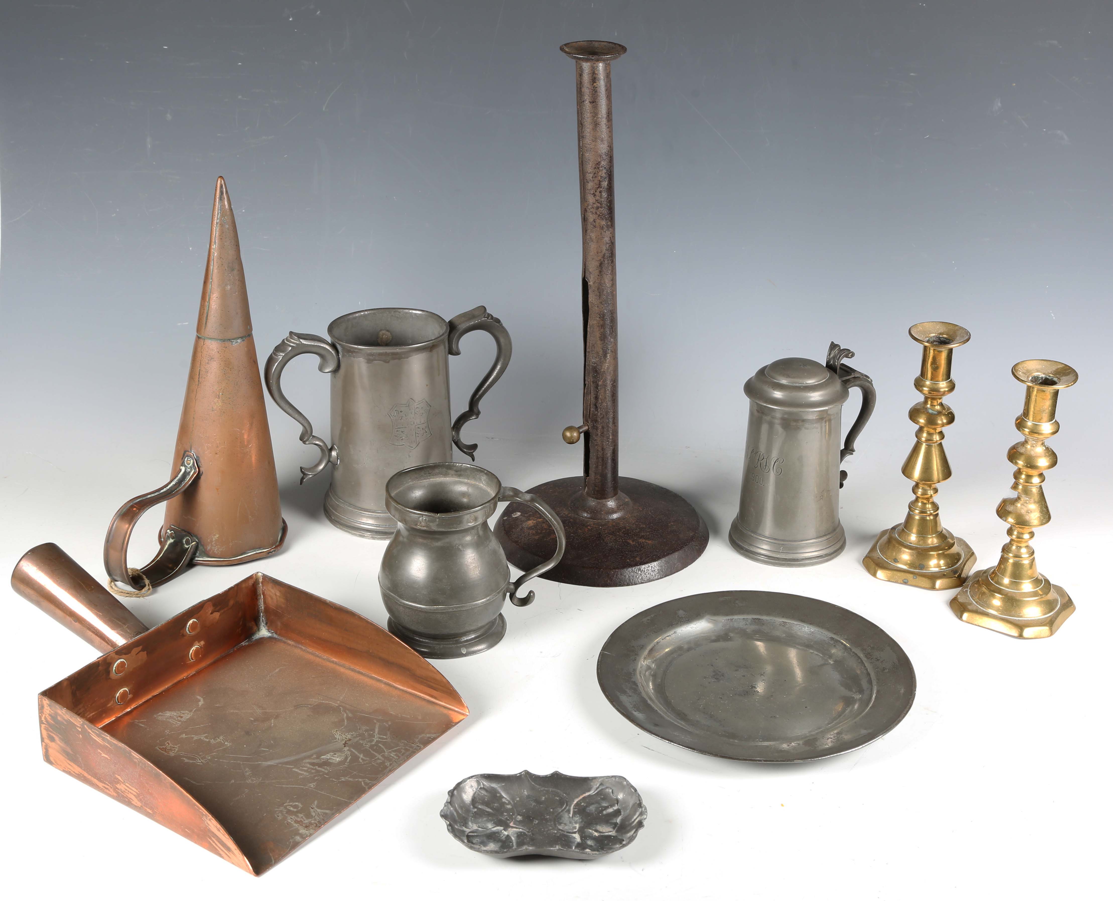 A 19th century wrought iron hog scraper ejector candlestick, height 42cm, together with a group of 19th century pewter and copper wares.