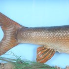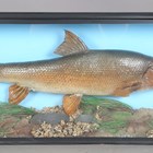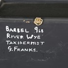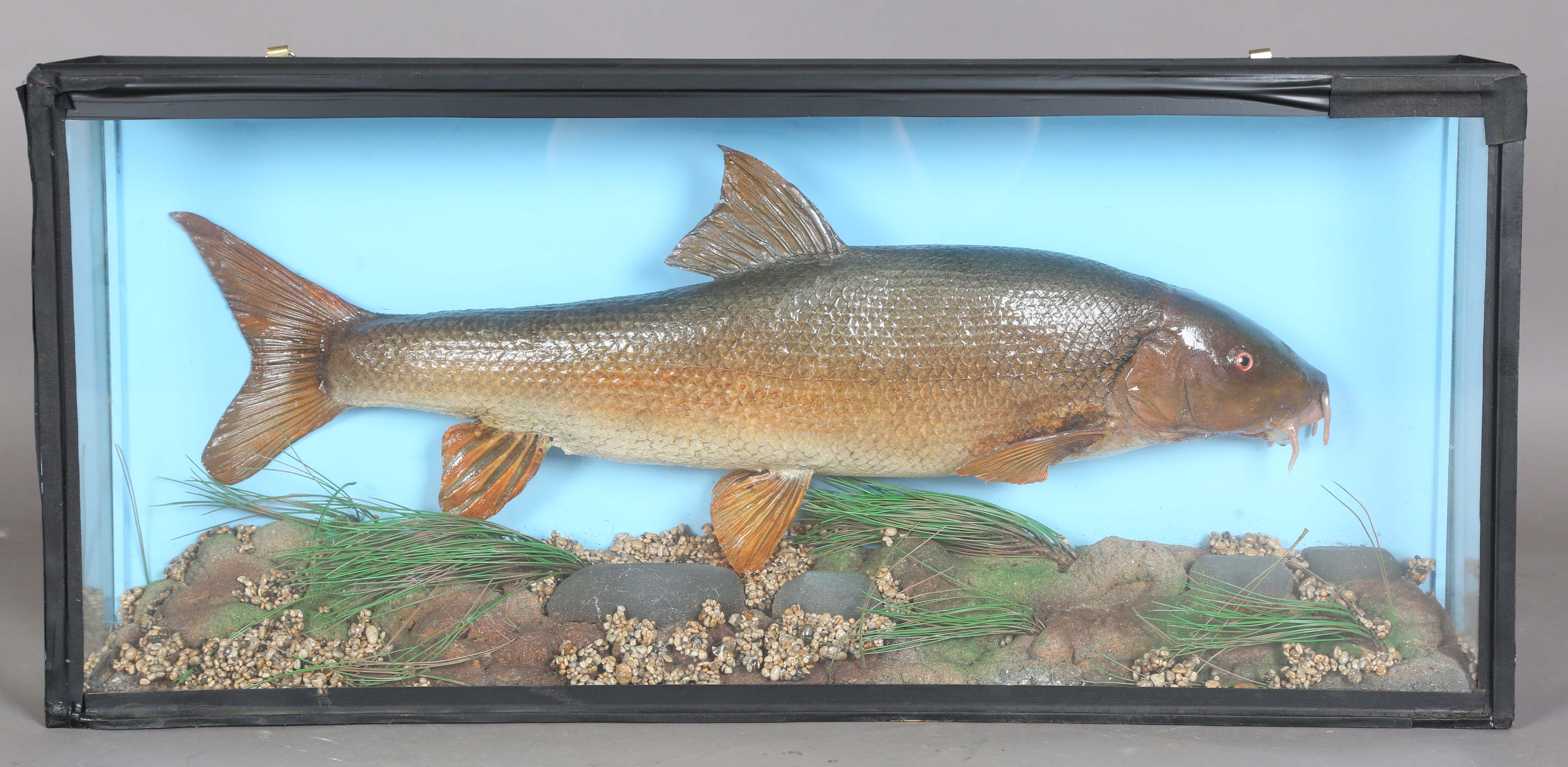 A 20th century taxidermy specimen of a barbel, the stuffed fish mounted within a glazed case, the reverse inscribed 'Barbel 9lb River Wye Taxidermist G. Franks', height 40cm, width 89cm.