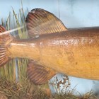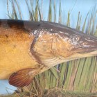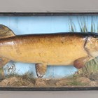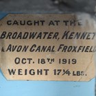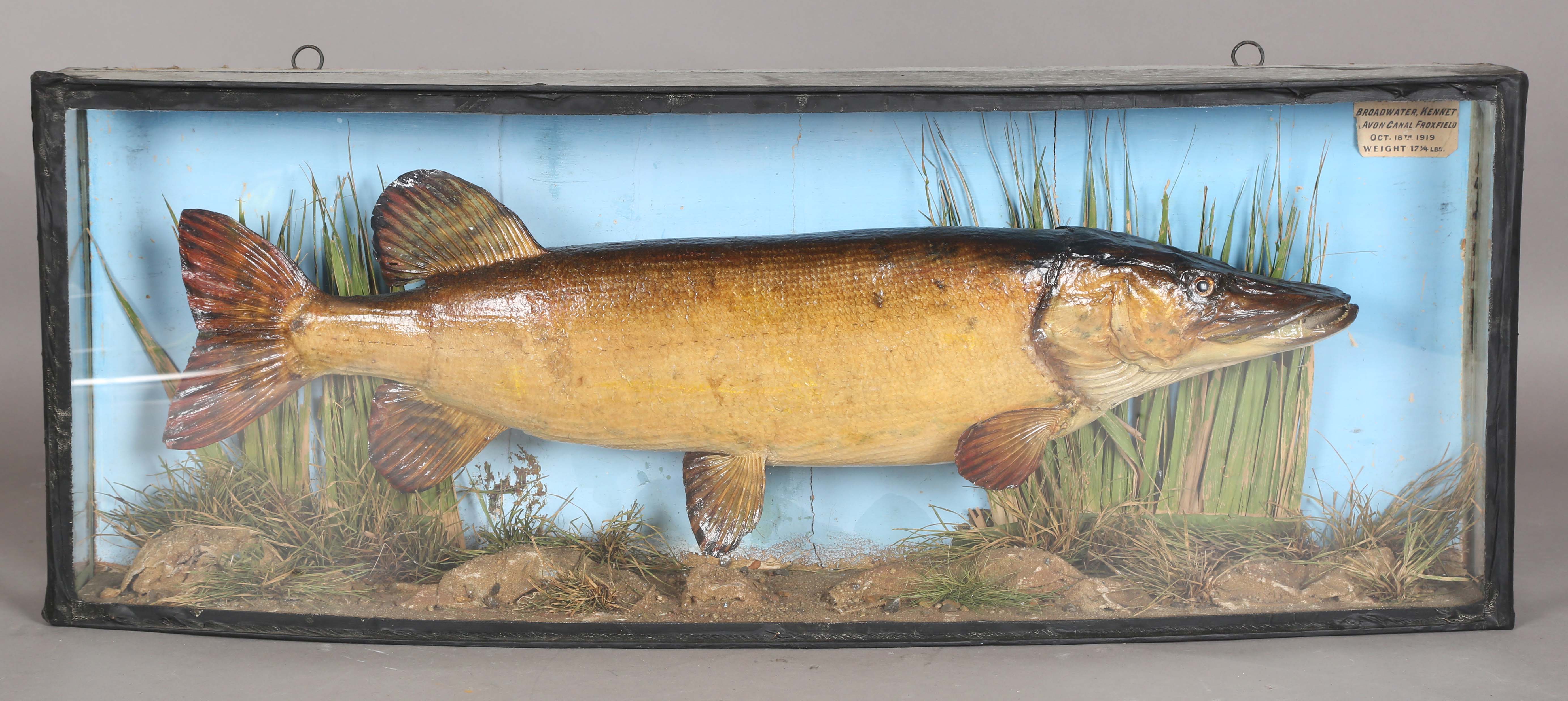 An early 20th century taxidermy specimen of a pike, the stuffed fish mounted within a bowfront case with later perspex front, bearing label to interior, inscribed 'Caught At The Broadwater, Kennet & Avon Canal Froxfield Oct. 18th 1919 Weight 17¼lbs', height 40cm, width 107cm.